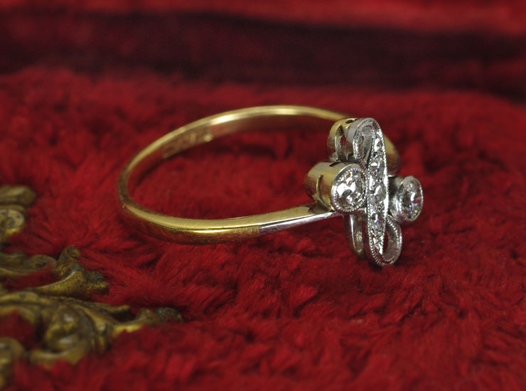 リングはやや縦長のデザインで、縦13ミリ、横11ミリ。ひときわ強いダイヤの輝きから目が離せない美しいアンティークリングです。