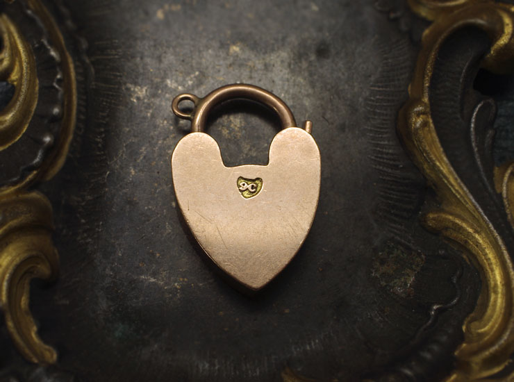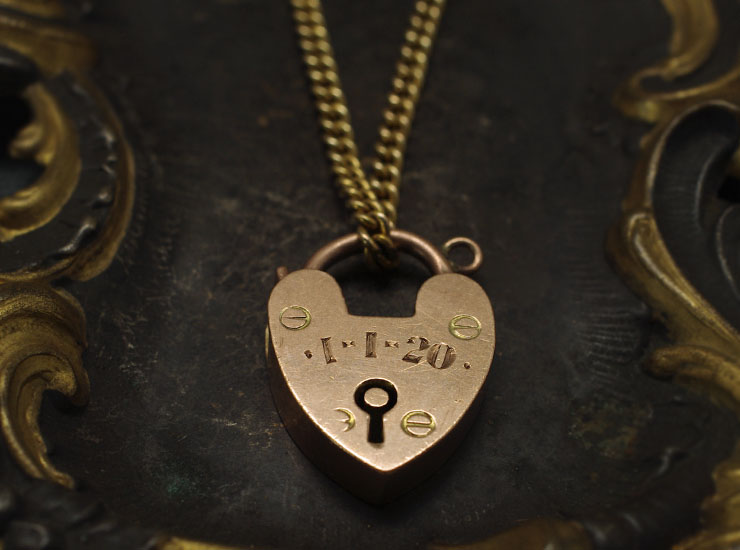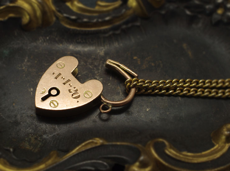 1920年頃のハート型の可愛らしいパドロック(南京錠)です。表には「1-1-20」と1920年1月1日を示す日付が刻まれています。特別な記念日だったのでしょう。地金は9金。掲載写真では色が黒ずんで写っていますが、実物は綺麗なピンクを帯びたゴールドです。パドロックは鍵を使って開けるのではなく、フックの突起部分を押しながら上げると、開けることができます。閉める時は、カチリと心地よい音がしてしっかりと閉まります。