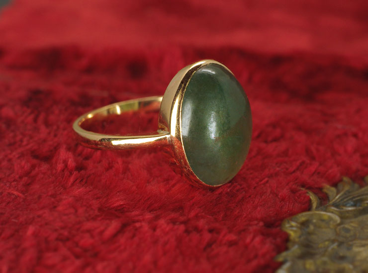 地金は18金。翡翠のサイズは、縦15ミリ×横12ミリとかなり大粒です。渋めの石がお好みの方にお勧めの美しいヴィンテージリングです。