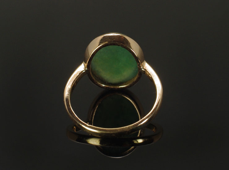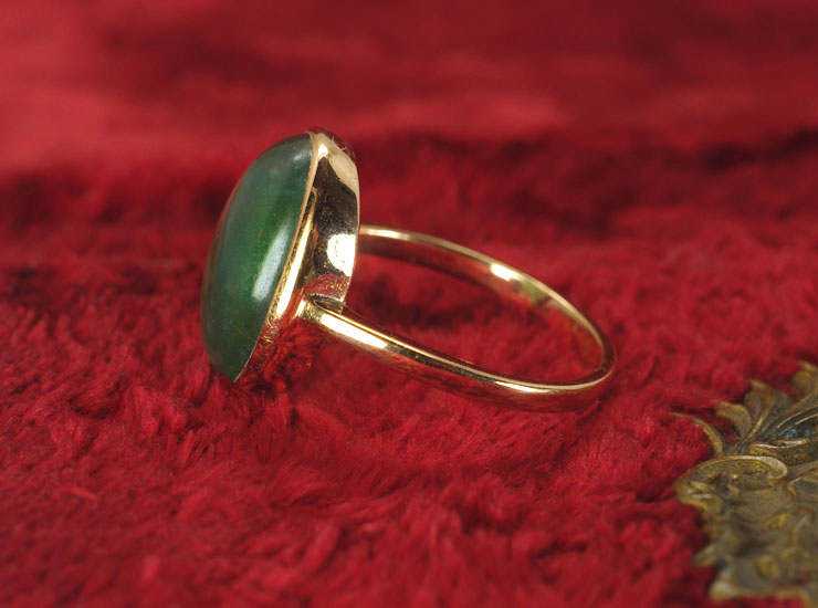 リング内側に刻印の一部がわずかに確認できますが、判別できません。ゴールドテスターにて18金と確認済み。ヴィンテージ18金翡翠リングは良い状態です。