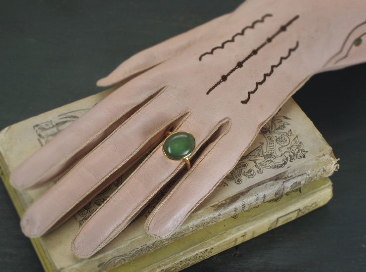 1950年頃のイギリス製ヴィンテージリングです。大粒の翡翠が美しいシンプルなデザインのリングです。パワーストーンとしても知られる翡翠は、多くの国で古来よりお守りとして身に着けられてきました。こっくりとした滑らかな深緑で、自然光を当てると渋さの中に透明感があります。写真では艶がほとんどなく写っていますが、実物は写真よりもずっと艶があり、細かな傷も目立たず綺麗です。