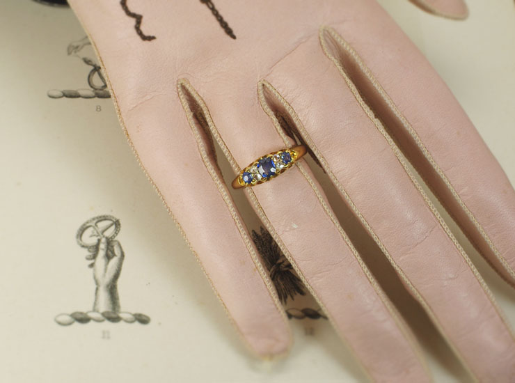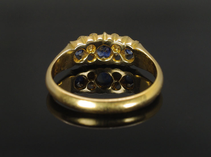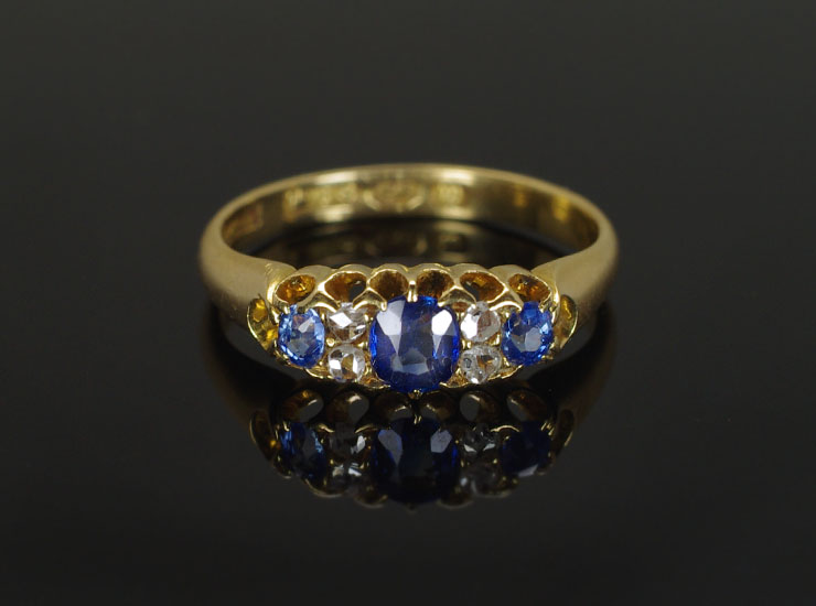 ヴィクトリアン後期1896年のイギリス製アンティークリングです。鮮やかなブルーサファイアは透明感があり、手元を上品に華やげてくれます。サファイア3石の間には、ローズカットのダイヤが2石ずつ合計4石セットされています。ダイヤは1.5ミリ〜1.8ミリととても小さいのですが、光を拡散してくれるような美しい輝きでサファイアを引き立ててくれます。
