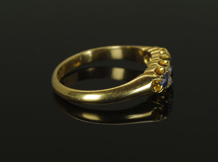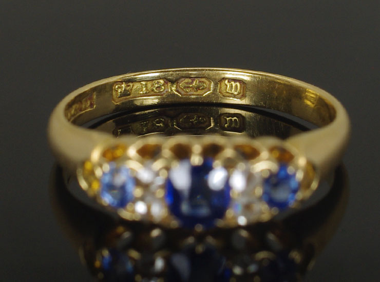 リング内側に18金、1896年を示すイギリスのホールマーク(刻印)入り。アンティーク18金サファイアダイヤリングは良い状態です。