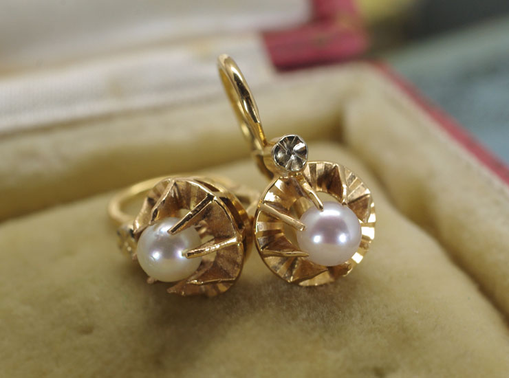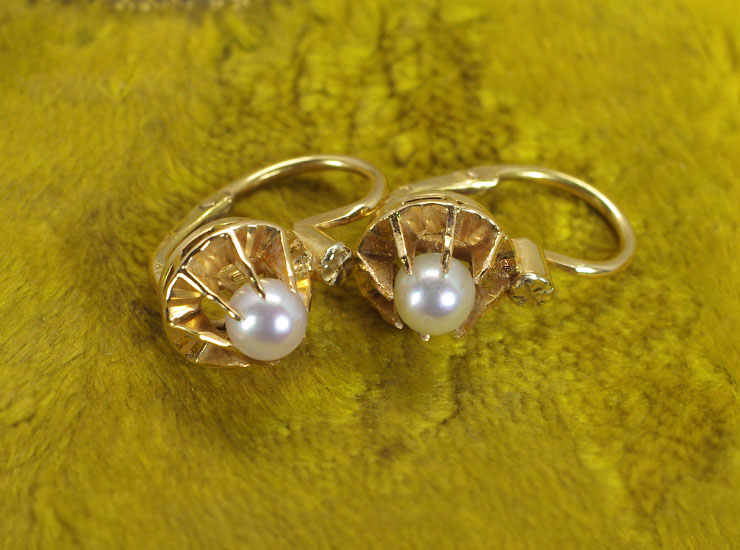 1930年頃のフランス製アンティークピアスです。耳のホールの後ろから通して前で留めるドルムーズと呼ばれるタイプのピアスです。使用されているのは天然真珠ではなく当時の古い養殖真珠ですが、艶々と美しい照りです。パールは爪で留められているように見えますが爪はほとんど飾りで、実際にはピアス本体の針がパールを刺してしっかりと固定しています。
