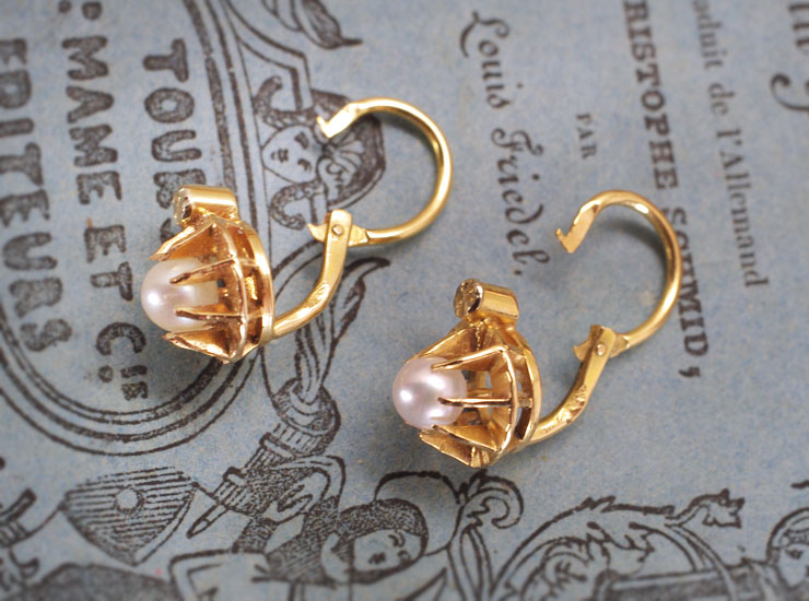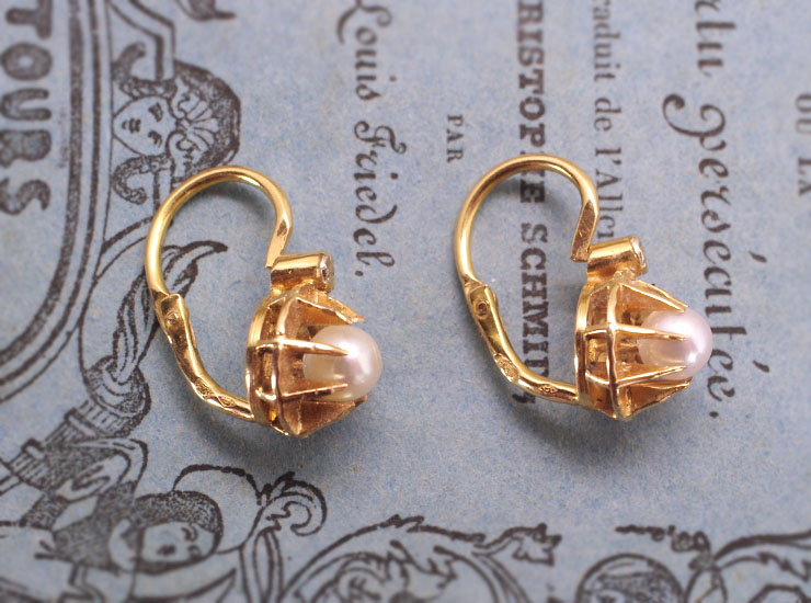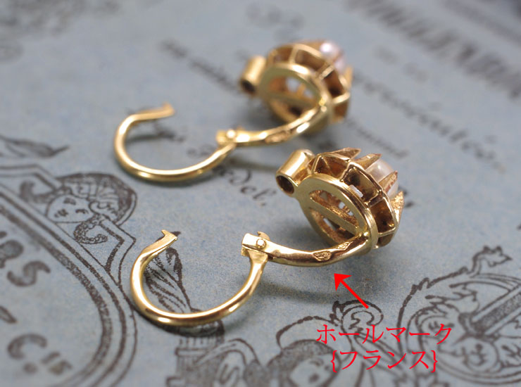 ピアスにフランスの18金のホールマーク(鷲の頭)入り。アンティーク18金パールピアスは良い状態です。