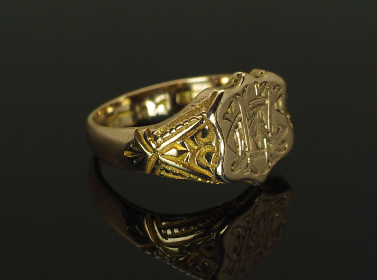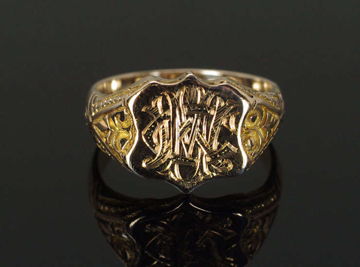 1910年のイギリス製リングです。シールド(盾)型のフェイスにモノグラムが彫られたシグネットリングと呼ばれる指輪です。通常シグネットリングは男性用の大きなサイズのものがほとんどですが、こちらは約10号とシグネットリングにしてはかなりサイズが小さめです。特にサイズ直しをした形跡もないため、元々男の子用に作られたものなのかも知れません。小さいながらもずしりと重量感があり、しっかりとした作りの上美しいデザインですので、サイズが小さめのシグネットリングをお探しの女性にまさにぴったりだと思います。