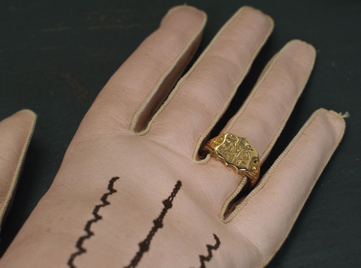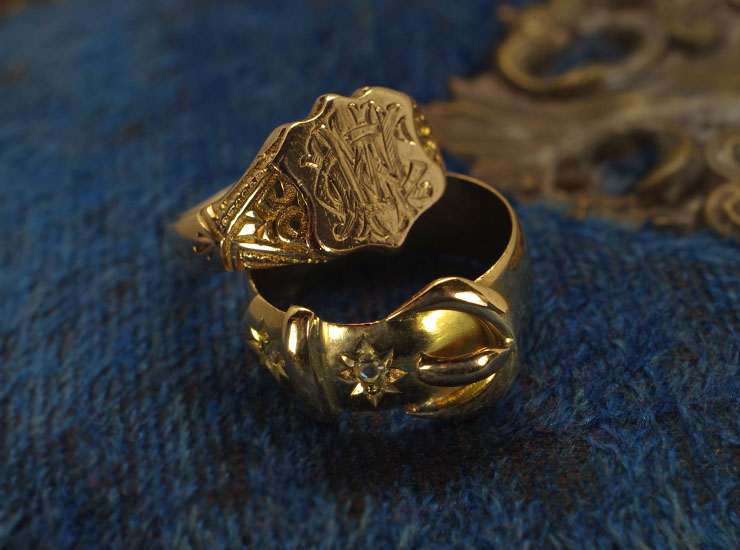 地金は9金。掲載写真では撮影時の光の反射で黒ずんでいるように見えますが、実物は綺麗なイエローゴールドです。シールドは縦11ミリ×横9.5ミリ。程よいゴツさが恰好いいアンティークリングです。※リングが二つ写った写真では、上のリングが当商品です。