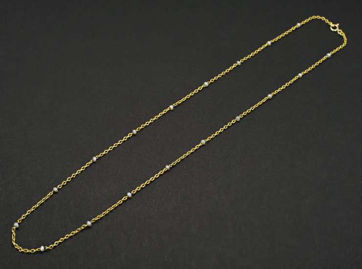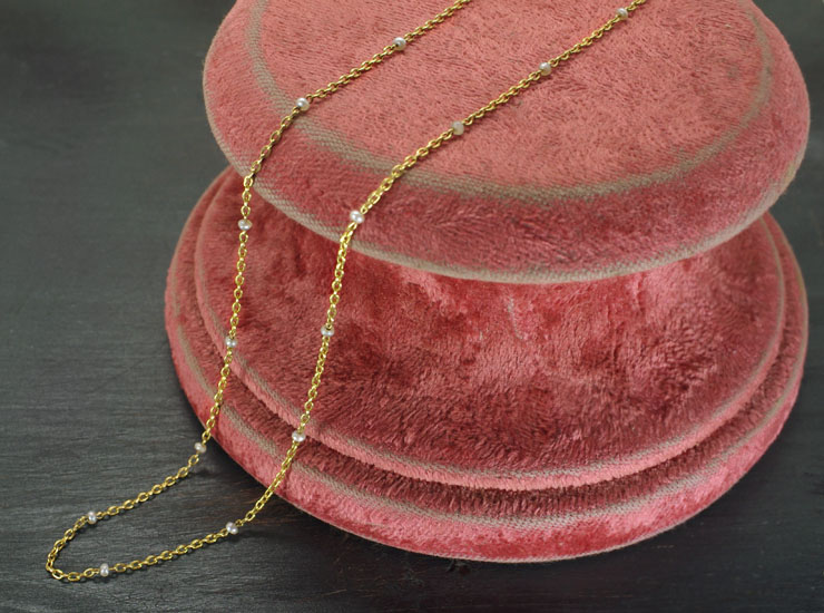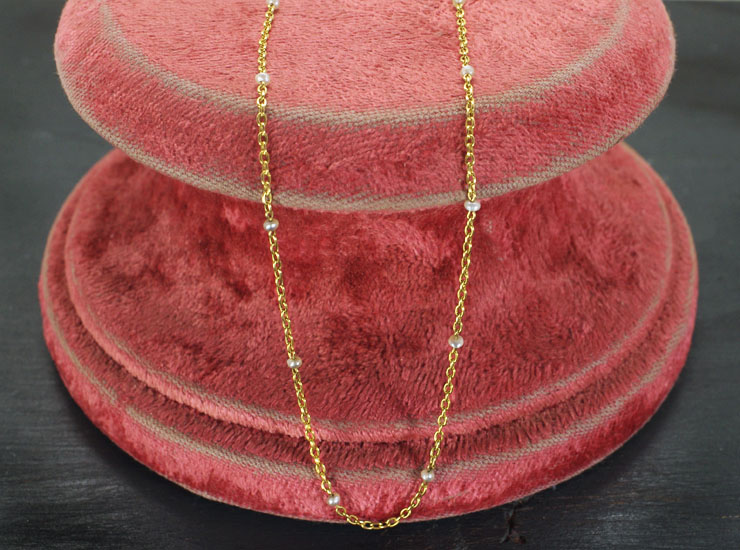 1900年頃のフランス製アンティークネックレスです。わずか1.5ミリ程の小さな天然真珠に穴が開けられ、18金のチェーンに通されています。パールは全部で18個あり、グレーがかった色合いに、形も真ん丸ではなくややいびつで天然ならではの風合いです。