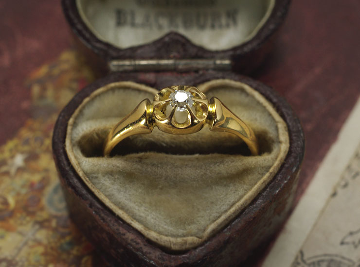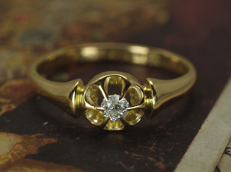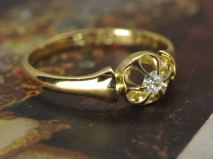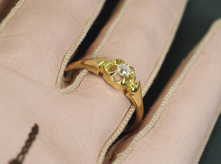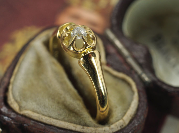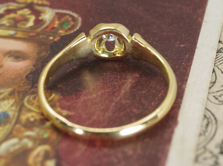 ダイヤは直径2.8ミリ。拡大写真でご確認いただけますが、ダイヤの周囲がゴツゴツと粗いカットになっています。そのため、リーズナブルな価格でご提供させていただきます。肉眼では確認できない程度のもので、リング全体の状態も良いので、アンティークダイヤリングを日常的に気軽にご使用になりたい方に特におすすめです。地金は18金イエローゴールド。