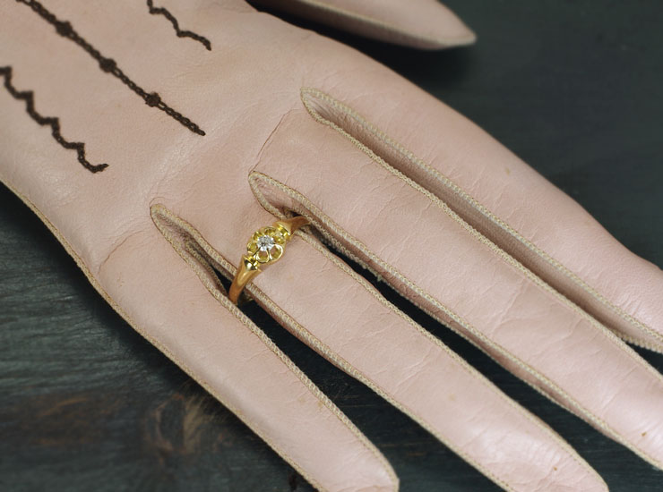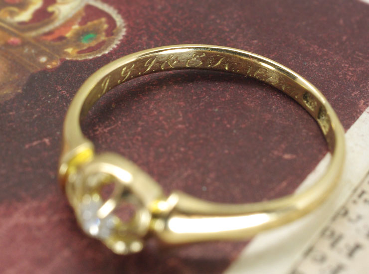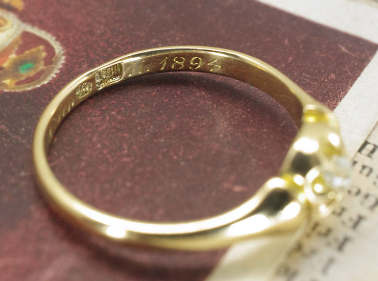 1890年頃のイギリス製アンティークリングです。小さなオールドヨーロピアンカットのダイヤの指輪。花びらのように丸みを帯びた6本の爪に留められたダイヤは、小さいけれどキラリと煌めきます。リングの内側には少し消えて見えにくくなっていますが、イニシャルと1894(1894年)の文字が刻まれています。愛する女性に贈られた婚約指輪だったのかも知れません。