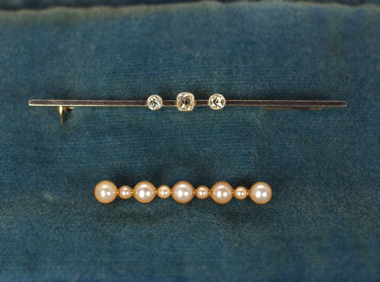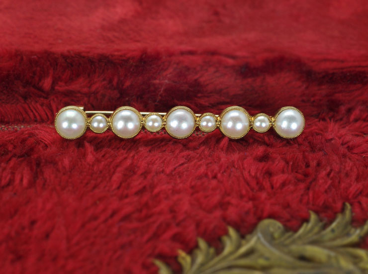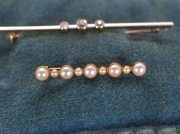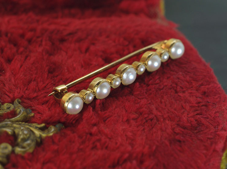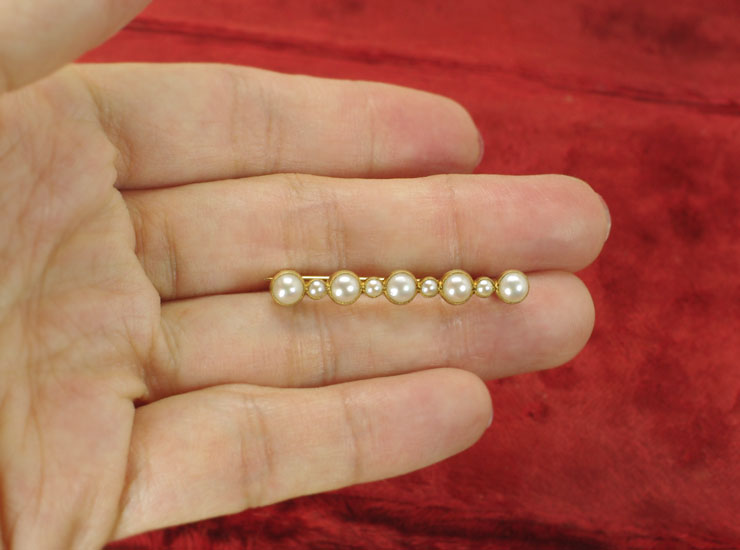 1930年頃のイギリス製アンティークブローチです。全長わずか34ミリの小さなパールブローチ。明るいクリーム色の艶が美しい真珠です。大きなパールは4ミリ、小さなパールは2ミリ。大小のパールが交互に並び、ブローチ初心者の方でもさりげなくお使いいただける清楚で可愛らしいデザインです。小さなブローチですが、セッティングはゴールド(地金はピンまですべて14金)がパールを包むように厚みがあり、しっかりとした作りです。ピンを留める部分は、ピンが外れないようにロックを回して固定するタイプで着けていて安心です。※掲載写真のダイヤのブローチは商品には含まれません。