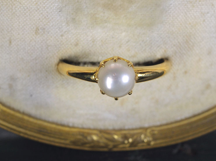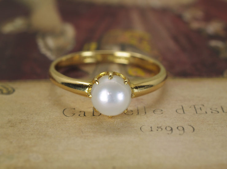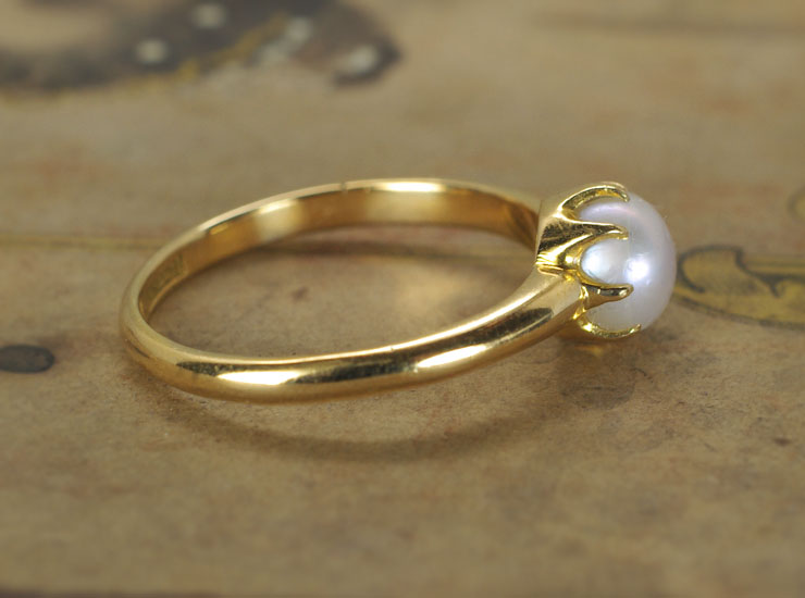 1950年頃のイギリス製ヴィンテージリングです。滑らかな照りが美しい一粒の淡水養殖真珠の指輪。パールのサイズは6.5ミリです。一粒のシンプルなデザインですが、爪が丸く小さいので全体的にコロンと可愛らしい雰囲気です。