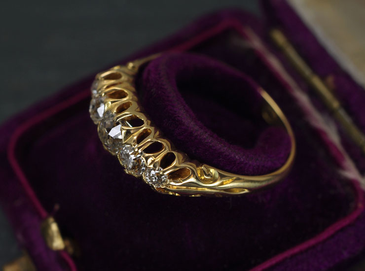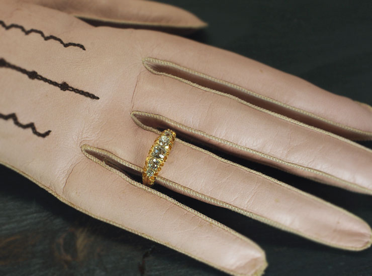1890年頃のイギリス製アンティークリングです。薄暗がりの中でも底から光を発するように輝く美しいダイヤ。やや横長のオールドマインカットのダイヤが横に並び、指を動かすたびに無数の光が溢れます。このようなダイヤが複数並んだトラディショナルなアンティークダイヤリングは、通常もっと小さなダイヤが使われることが多いのですが、こちらのリングの一番大きなダイヤは縦3.8ミリ×横4.2ミリと大きめですので存在感があります。また、コロコロとしたかなり厚みのあるダイヤですので、立体的な煌めきで表情が豊かです。少しインクルージョン(内包物)のあるダイヤモンドですが、それ以上に豊かな輝きと透明感が格別の美しさを見せてくれます。