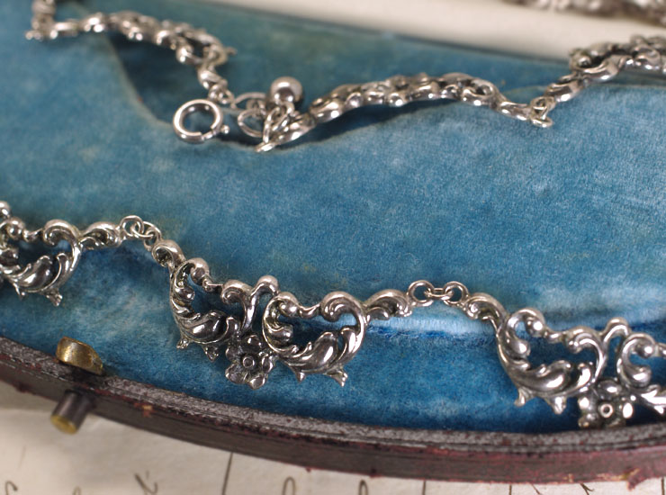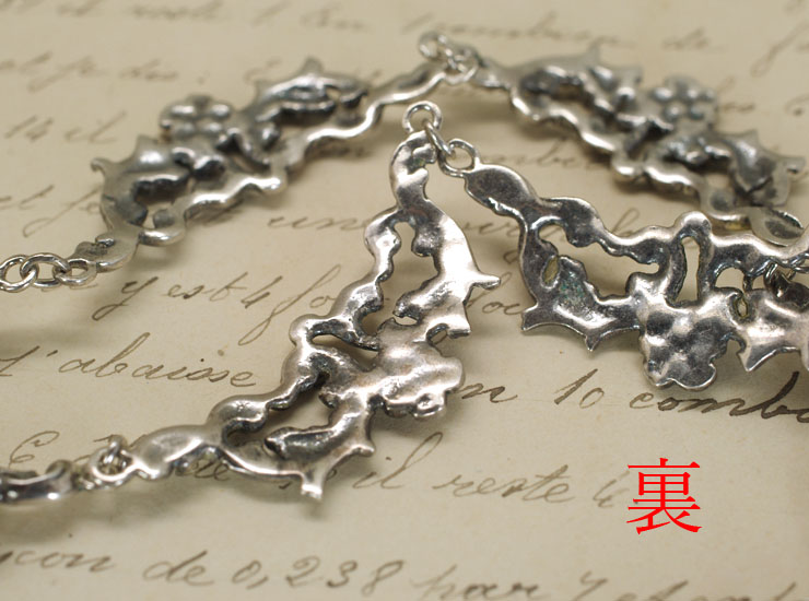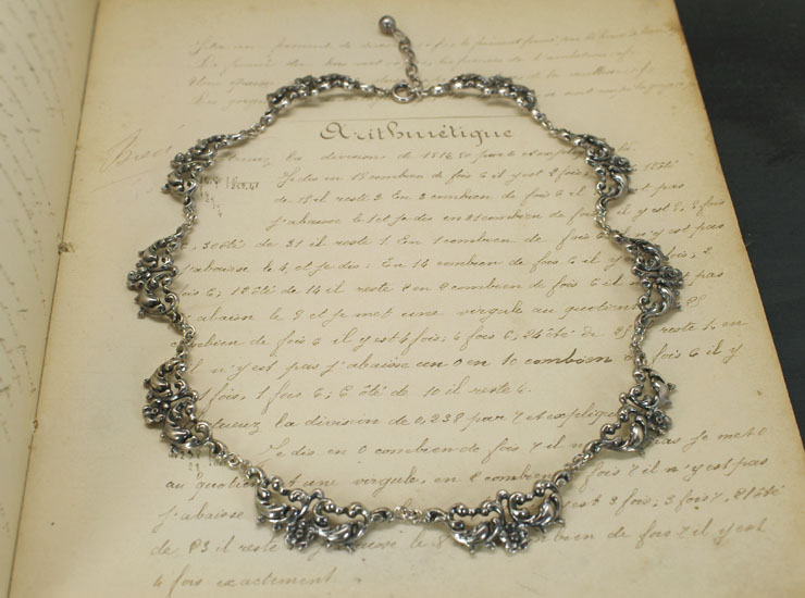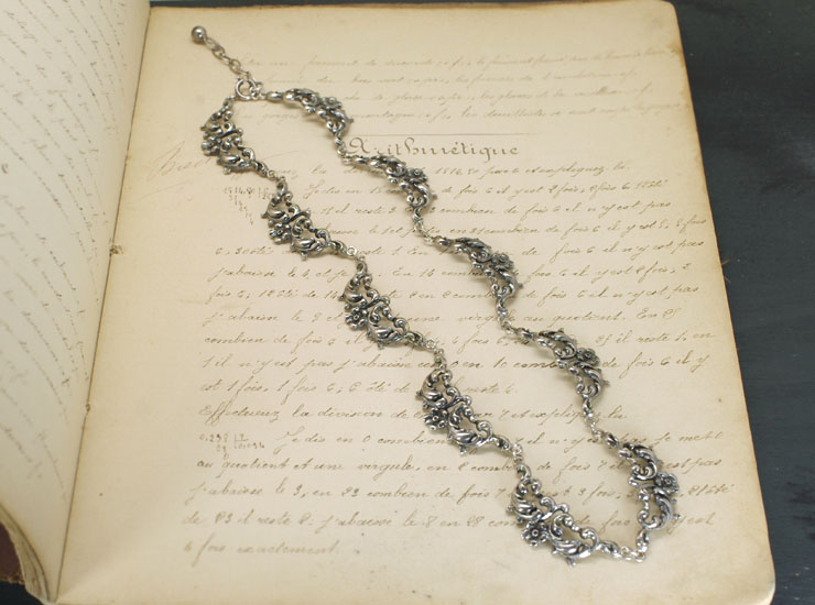 1930年-1940年頃のドイツ製ネックレスです。アールヌーヴォーの草花が美しくデコルテを飾ります。ネックレスは10個のパーツで構成され、パーツのサイズは縦13ミリ×横40ミリ。パーツは平らではなく、デコルテに沿うように真ん中が弓なりにカーブした立体的なラインです。