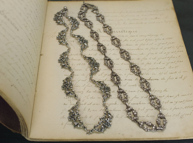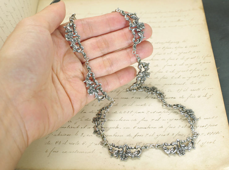 地金はシルバー835。シルバー835はドイツ等の古い銀製品によく見られる品位です。全体の長さは40センチで、延長チェーンが付いていますので、43センチまで長さが調節できます。重量は31.3グラム。重厚感のある堂々たる風格のネックレスです。※ネックレスが2本写っている最後の写真は左のネックレスが当商品になります。