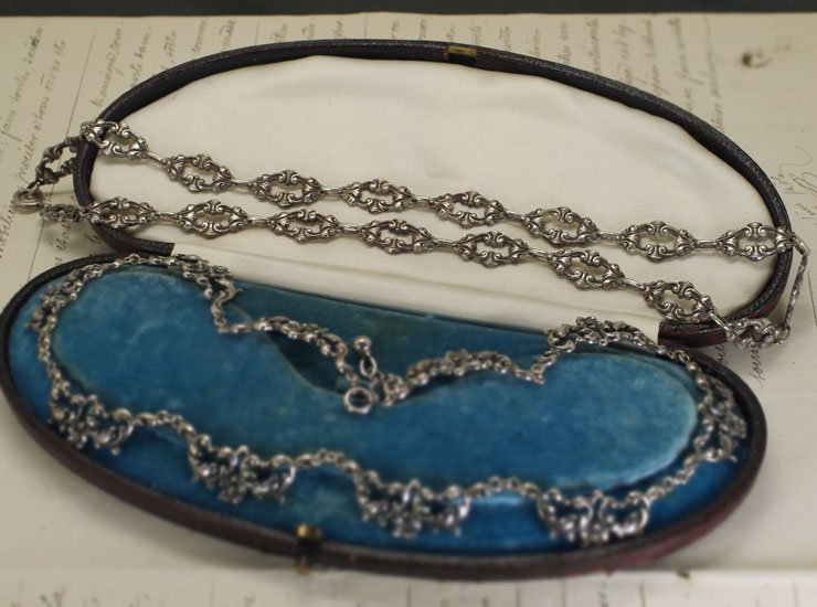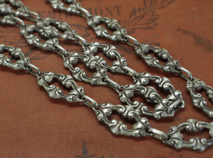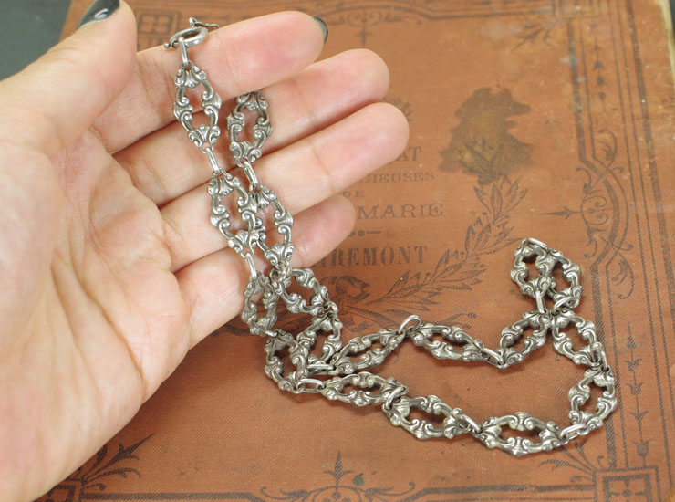 地金はシルバー830。シルバー830はドイツ等の古い銀製品によく見られる品位です。現在主流のシルバー925(スターリングシルバー)よりも純度は低いですが、スターリングシルバーよりも強度があります。長さは47センチ。手首に巻いてブレスレットとしておつけいただいても素敵です。※ネックレスが2本写っている最後の写真は右のネックレスが当商品になります。