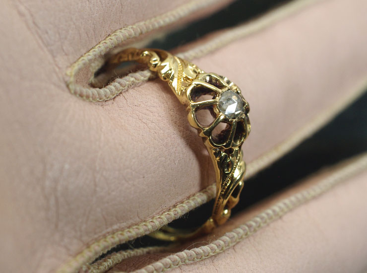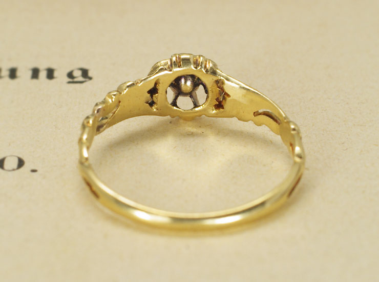 リング外側に擦れて薄くなっていますが、フランスのホールマーク(鷲の頭)が確認できます。アンティーク18金ローズカットダイヤは良い状態です。