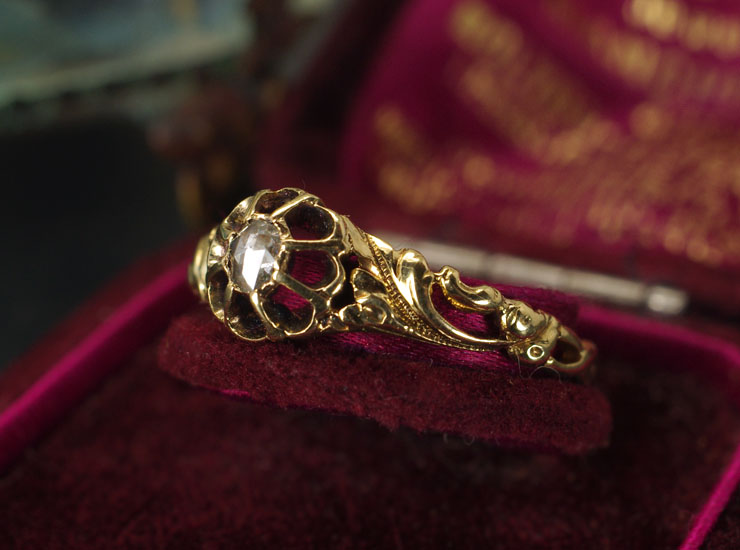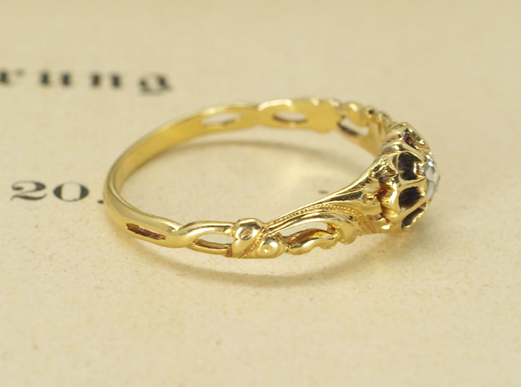 地金は18金。ややピンクを帯びた綺麗なゴールドです。ダイヤは2.5ミリ×3ミリ。繊細なディテールがいかにもアンティークらしい美しいアンティークダイヤリングです。