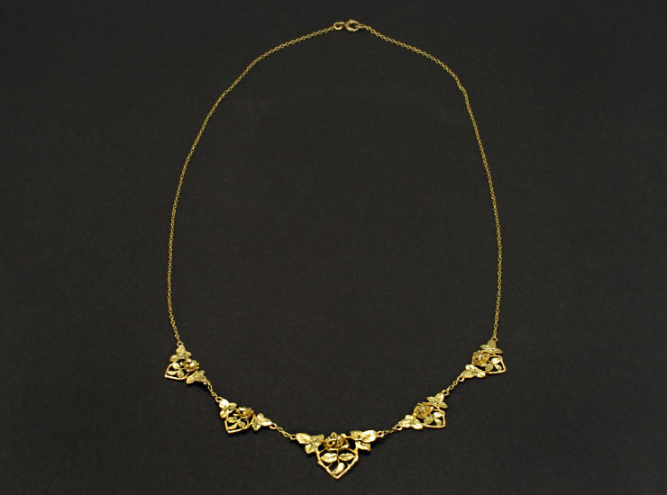 地金は18金で、全体は明るいイエローゴールド。葉の部分はほんのわずかに緑がかった18金ゴールドが使用されています。ネックレスは表だけではなく、裏まで丁寧に仕上げられています。チェーン部分も手作りです。チェーンは細く、より女性らしく見えるよう計算されています。重量は6.3グラムと特別重くはありませんが、手に取るとモチーフが自然な立体感で心地よい重みがあります。長さは44センチ。細やかに作り込まれた美しいアンティークネックレスです。