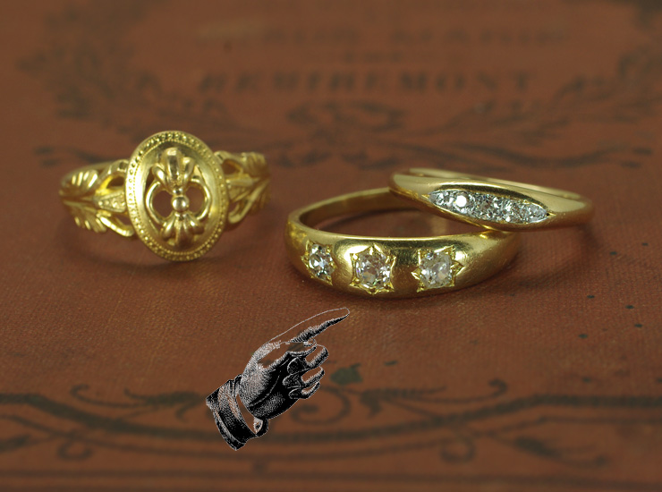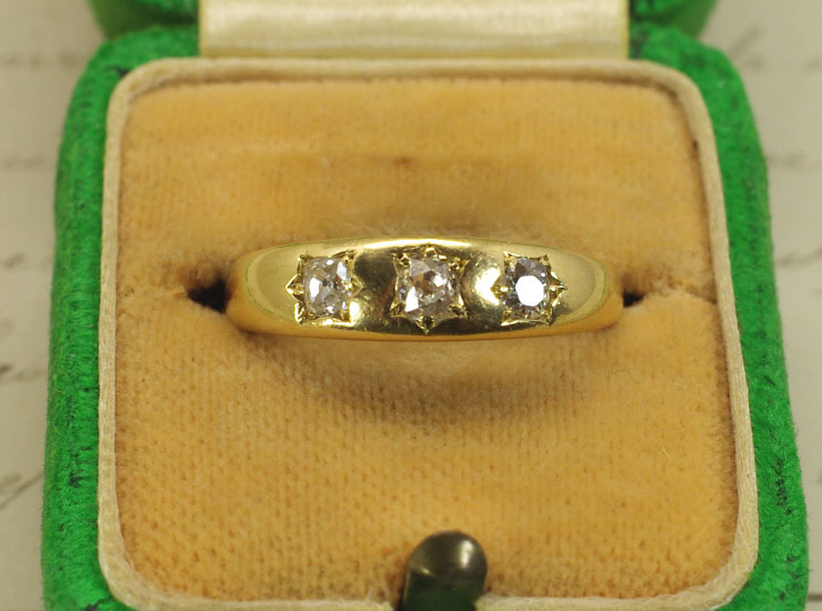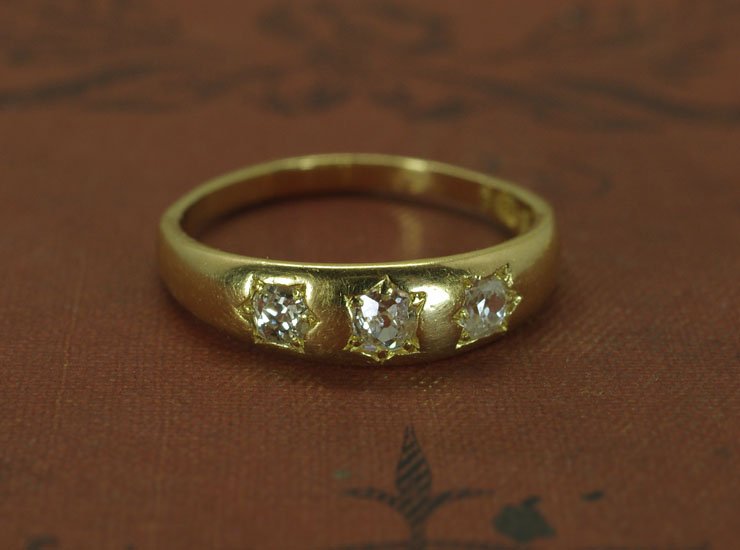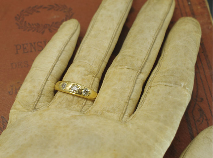 ヴィクトリアン後期1890年頃のイギリス製アンティークリングです。アンティークリングの定番とも言える、宝石が埋め込まれたように留められたジプシーリングと呼ばれるタイプの指輪です。ジプシーリングには色々なデザインがあり、1.5ミリ程の小さな石が使用されていることが多いのですが、このリングには少し大きめのオールドカットダイヤが使用されています。中央のダイヤは3ミリ×2.6ミリ、両端のダイヤは2.6ミリ。