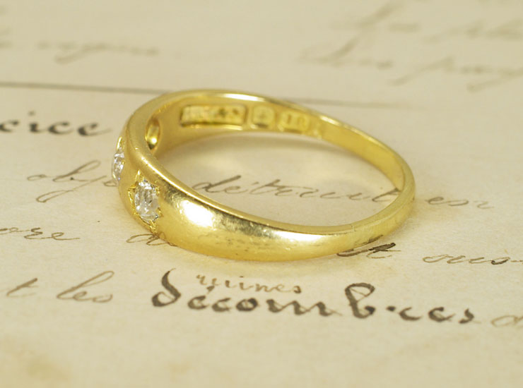 リング内側に18金を示すイギリスのホールマークが残っています。ホールマークは一部消えています。アンティーク18金ジプシーダイヤリングは良い状態です。
