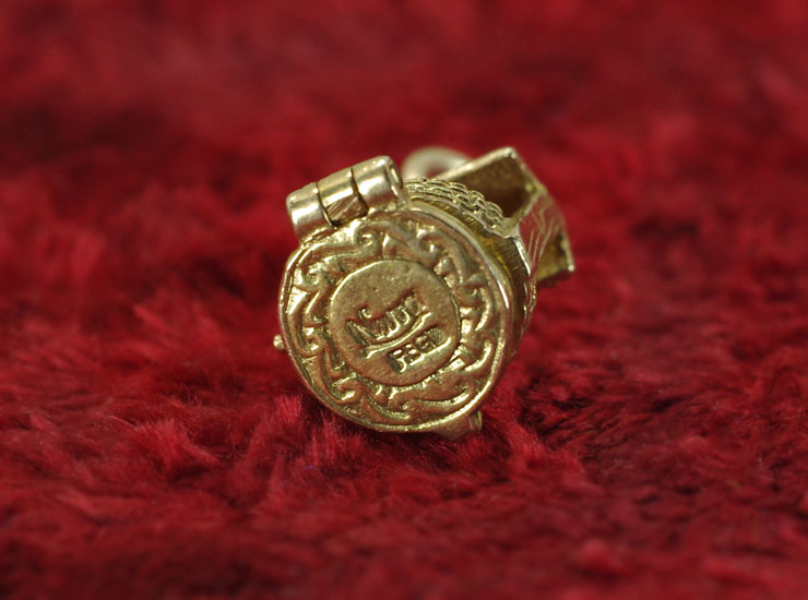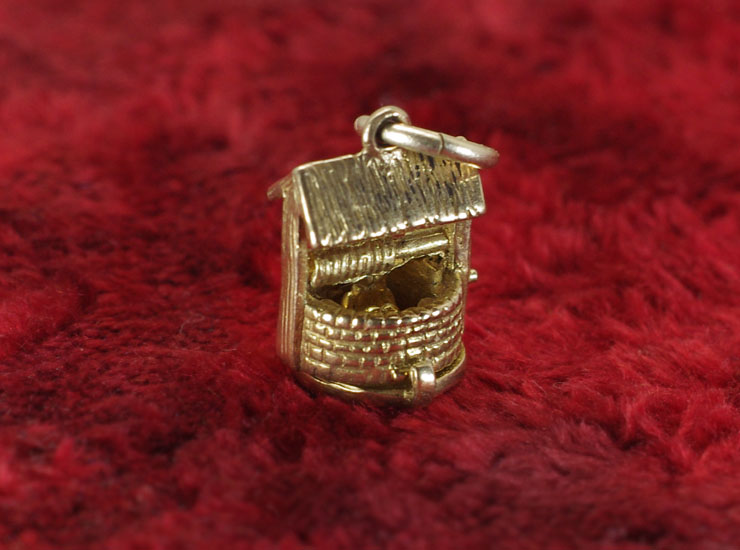 1962年のイギリス製ヴィンテージチャームです。「Wishing Well」(願い井戸)コインを投げ入れると願いを叶えてくれると言われ、ラッキーモチーフとして用いられてきました。指先に乗る程の小さな井戸を開けると、なんと中には妖精がいます。ピクシーと呼ばれる妖精です。とんがり帽子をかぶり、膝を立てて座っている可愛らしいピクシー。願い事を叶えてくれる井戸の中にピクシーまでいるというとても縁起の良いチャームです。