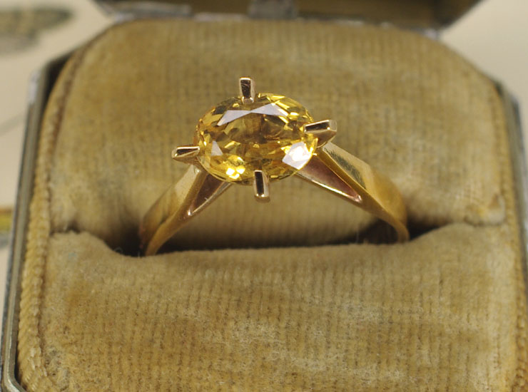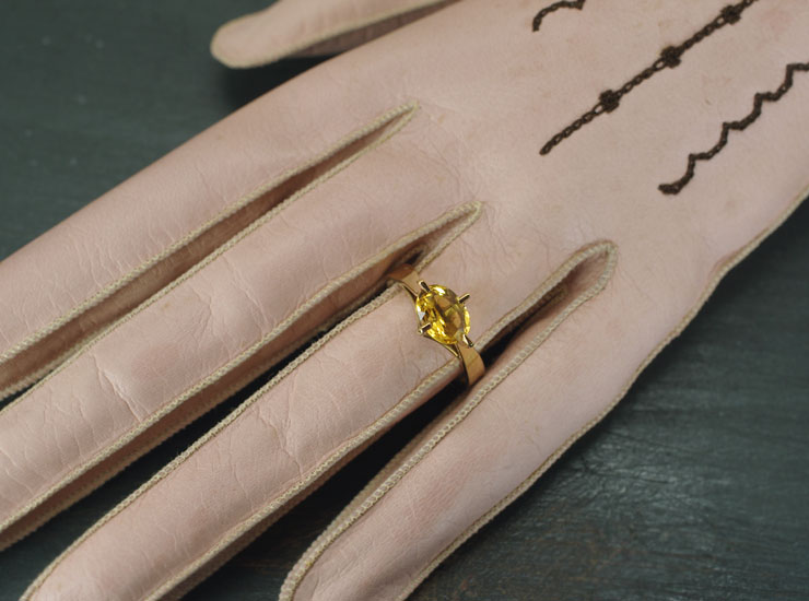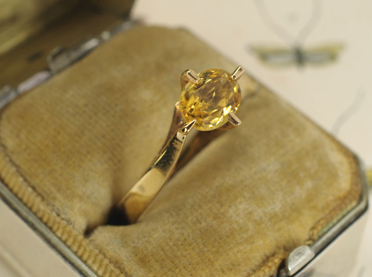 1960年-1970年頃のイギリス製ヴィンテージリングです。明るい黄色のシトリンが角ばった爪に留められたレトロなデザインのキュートな指輪。シトリンは縦6.5ミリ×横8.5ミリで綺麗な色合いです。爪の高さは7ミリ。地金は9金。惑星っぽいキッチュなデザインが可愛らしいヴィンテージリングです。