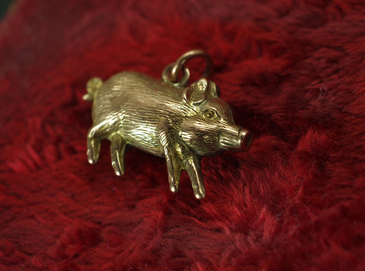 1950年-1960年頃のイギリス製ヴィンテージチャームです。ぷくぷくと丸っこい小さな豚ちゃん。つぶらな瞳に短い足、くるんと巻いたしっぽも可愛らしく着けていると、話題になること間違いありません。