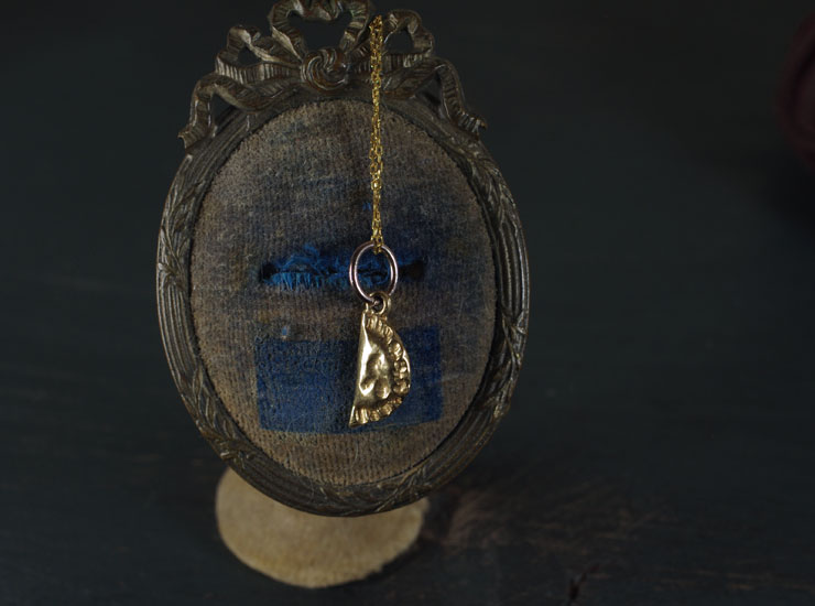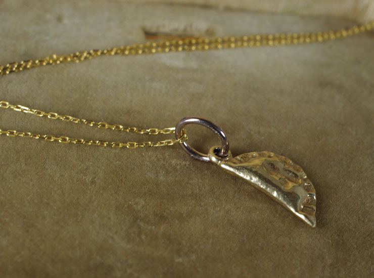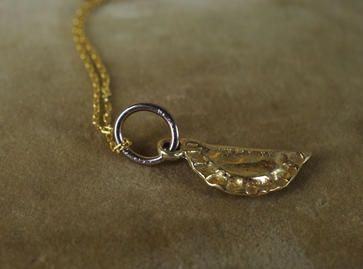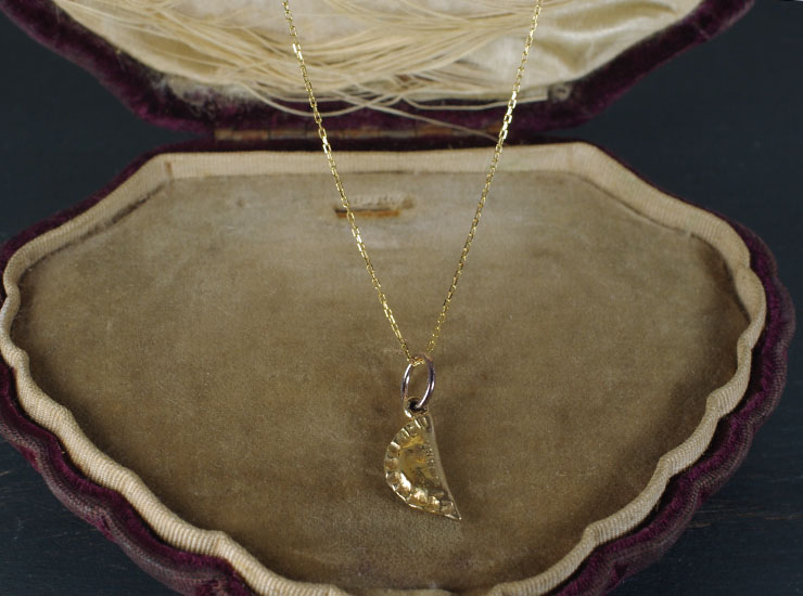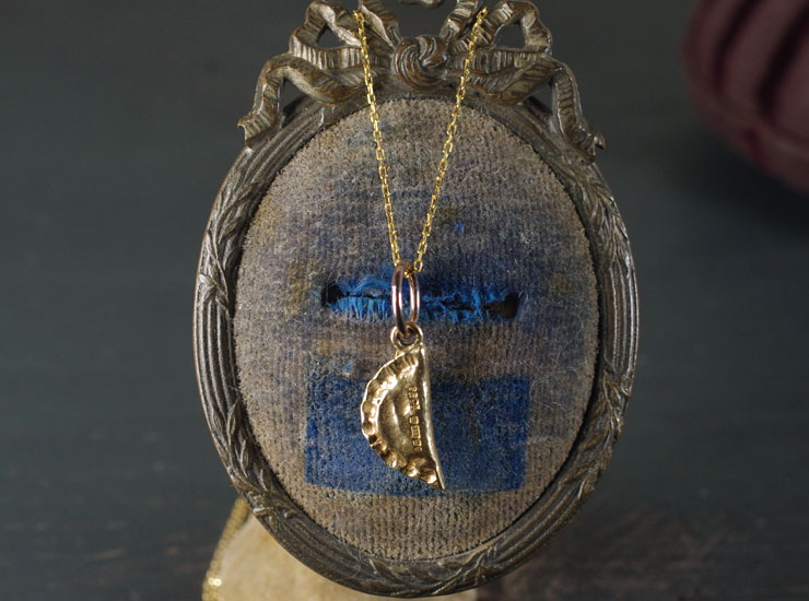 1978年のイギリス製ヴィンテージチャームです。イギリスのコーンウォール地方の名物料理「コーニッシュ・パスティ」がモチーフのユニークなゴールドチャームです。コーニッシュパスティはミートパイのような食べ物なのですが、ふちの波々や生地のたわみなどがリアルに表現されています。もちろん本物のゴールド(9金)で作られています。日本人にとっては、パイというよりも餃子に見えませんか?可愛らしくて、クスリと笑える楽しいゴールドチャームです。