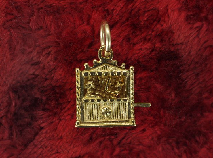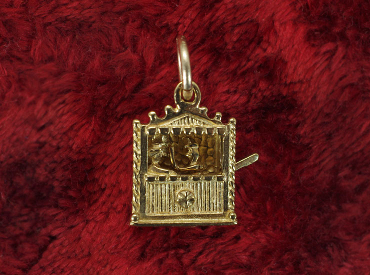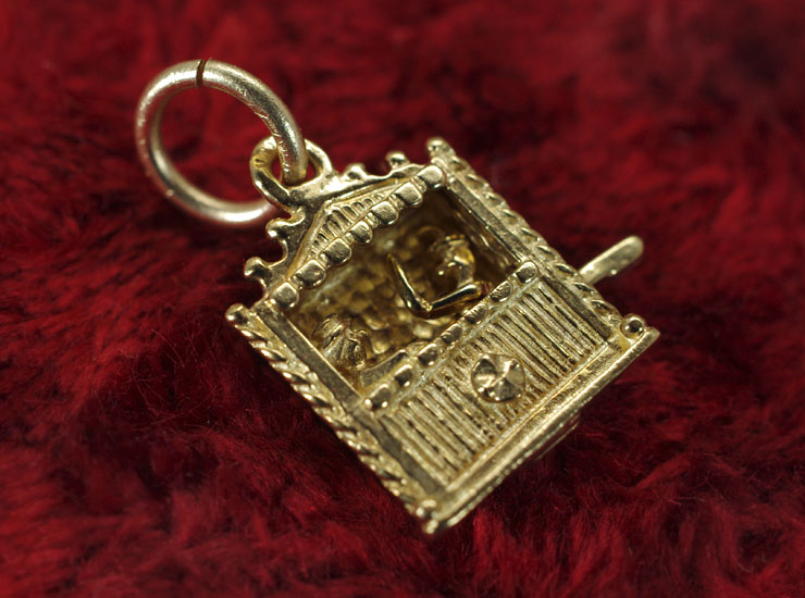 1960年頃のイギリス製ヴィンテージチャームです。移動式の人形劇がモチーフの動くチャーム。「Punch and Judy Show」(パンチとジュディ)という昔から子供たちに愛されてきたイギリスの人形劇のキャラクターで、マザーグースの詩の一遍です。(一説には17世紀頃に登場したキャラクターとあります。)愛すべきキャラクターのパンチがジュディと大げんかをするドタバタ劇なのですが、チャームのサイドにあるつまみを上下すると棒を持ったパンチが動いてジュディを叩くという動きをします。