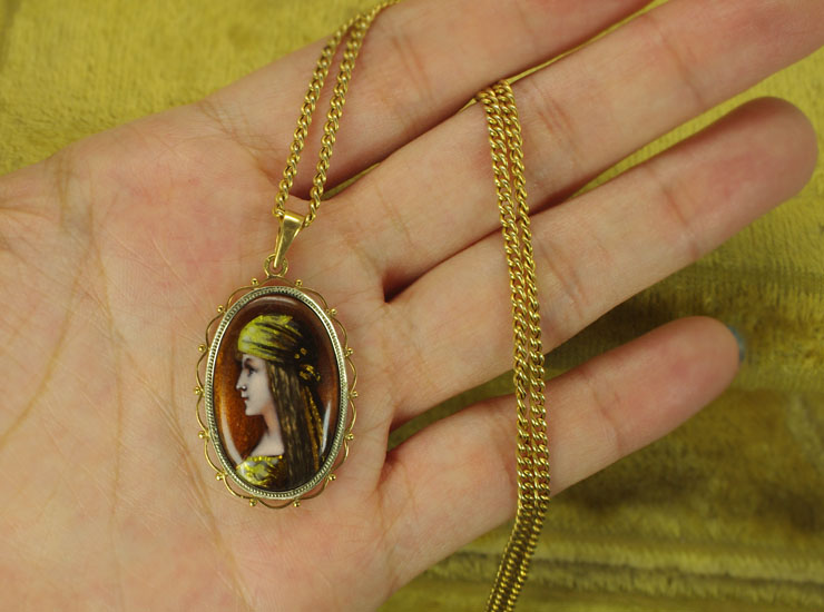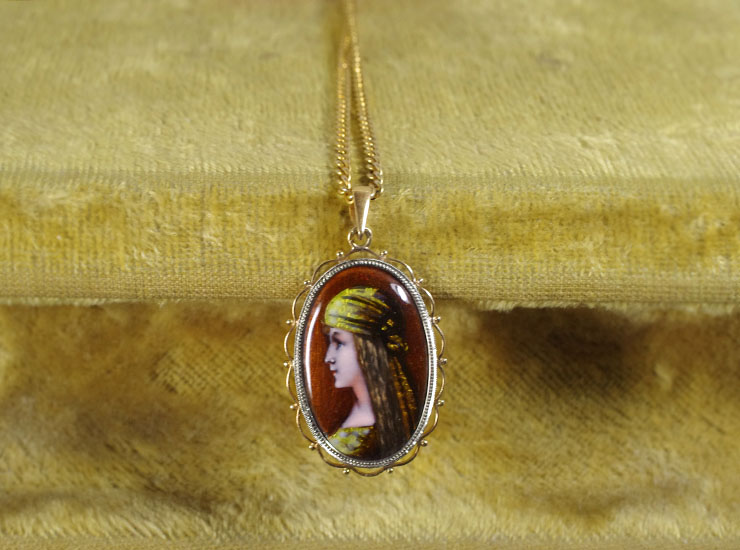 1910年頃のフランス製アンティークペンダントです。若い女性の横顔を描いたリモージュエナメルペンダントです。ブロンズカラーを背景に、凛とした表情の美しい女性。黄色の布を頭に巻き、同じく黄色の服をまとっています。ジプシーの女性のように見えます。全体的にシックな色合いですが、キラキラと貝のような光沢のある色彩があり、光の当たり具合によって鮮やかな色が浮かび上がります。リモージュエナメルのサイズは縦24ミリ×横16ミリ。