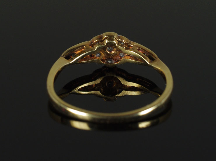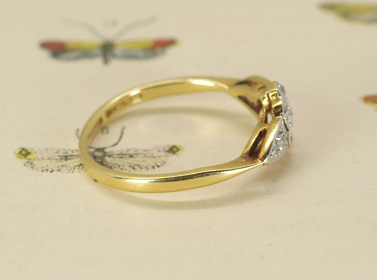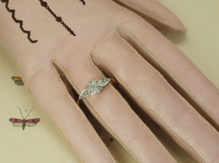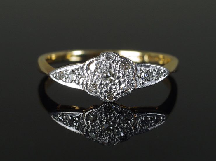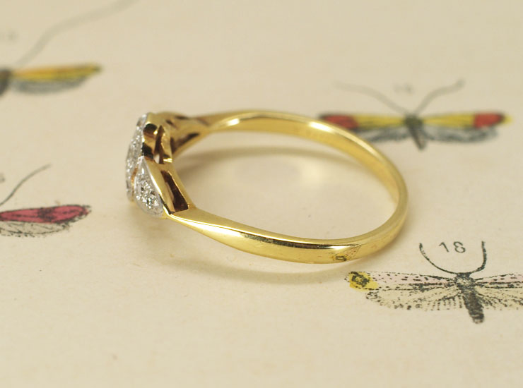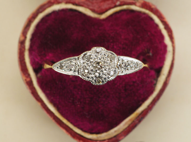 1920年頃のイギリス製アンティークリングです。デイジーリングと呼ばれる花の形のリングです。同じデイジーリングと言っても、ひとつとして同じものはなく、こちらのリングは両サイドの装飾が可愛らしさにエレガントさをプラスしています。花部分にはダイヤが7石、サイドには2石ずつ合計11石の小さなダイヤがセットされています。とても小さなダイヤですが、美しい輝きで品があります。