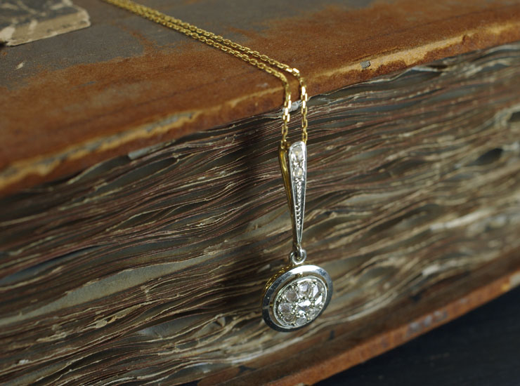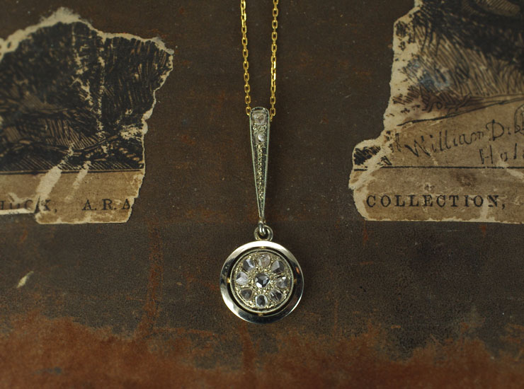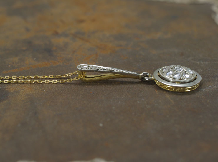 1910年頃のフランス製アンティークペンダントです。ローズカットダイヤのどこか儚げな煌めきが女性らしい気分を高めてくれます。アンティークのペンダントは、ゴージャスで大ぶりなものが多く、このペンダントのような小ぶりでいデイリーに着けやすいアンティークペンダントは意外と見つかりません。縦長のシルエットがクラシカルでエレガントです。着用時に見えるか見えないかという部分にまで施された細やかなゴールドの細工もアンティークならでは。地金は表面は18金ホワイトゴールドでサイド、裏は18金イエローゴールド。
