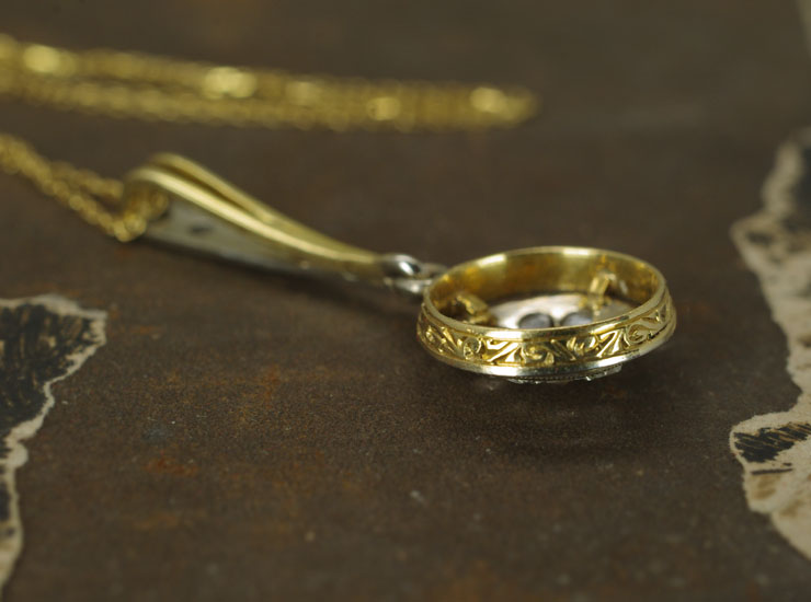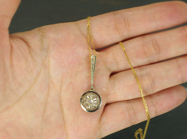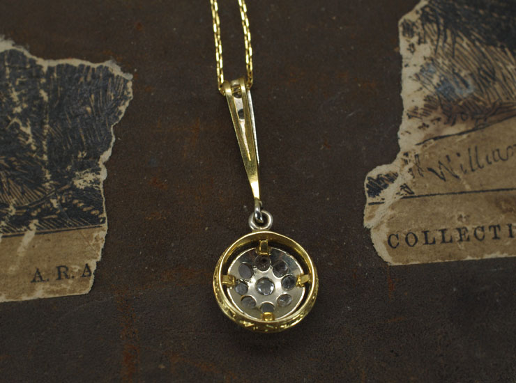 ペンダントに薄れて見えにくいですが、フランスの18金のホールマーク入り。アンティーク18金ローズカットダイヤモンドペンダントは良い状態です。※チェーンは商品には含まれません。