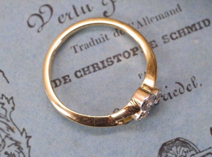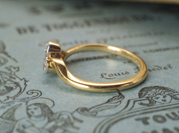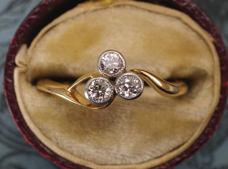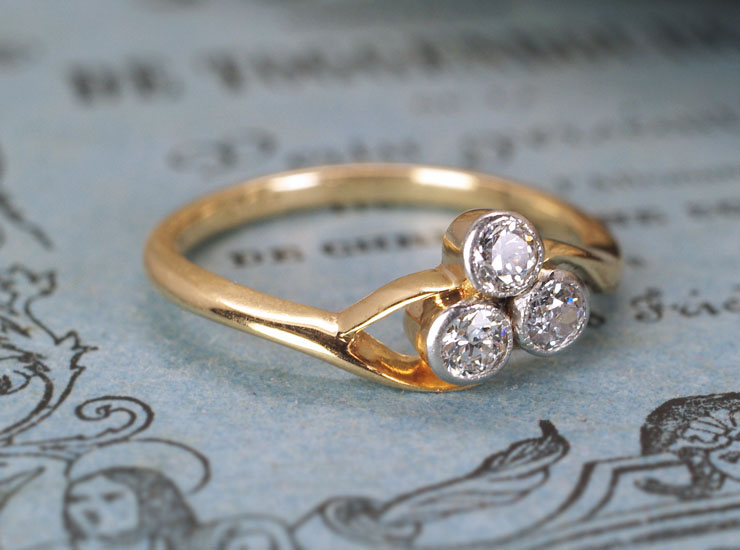 1920年-1930年頃のイギリス製アンティークリングです。三つ葉のクローバーのように仲良く並んだ3石のダイヤモンド。一石一石はけっして大きくはありませんが、透明感に溢れ、ほとばしる光の煌めきに思わず見とれてしまう美しさです。ダイヤはすべてオールドカットで直径2.8ミリ。アシンメトリーな曲線が優しい雰囲気を演出してくれます。