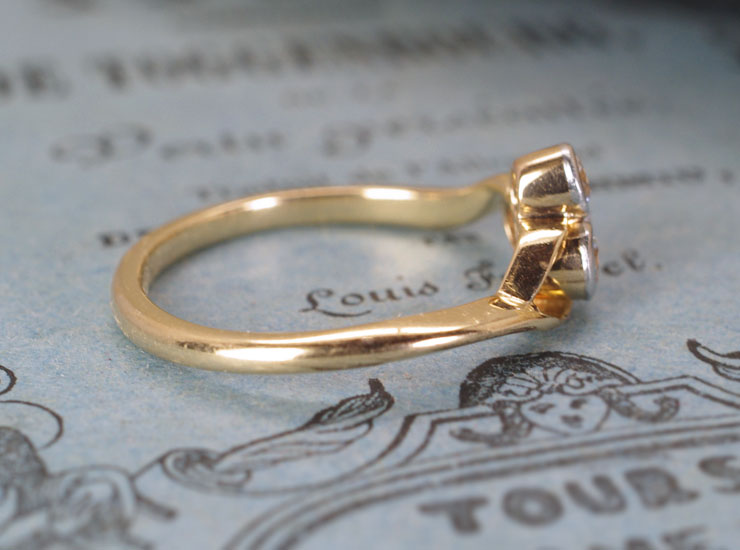 地金は白い部分はプラチナで、リング全体は18金イエローゴールド。どの指につけてもしっくりとくるデザインで、引っ掛かりも少なく、重ね付けも楽しめる日常使いしやすい大変美しいアンティークリングです。
