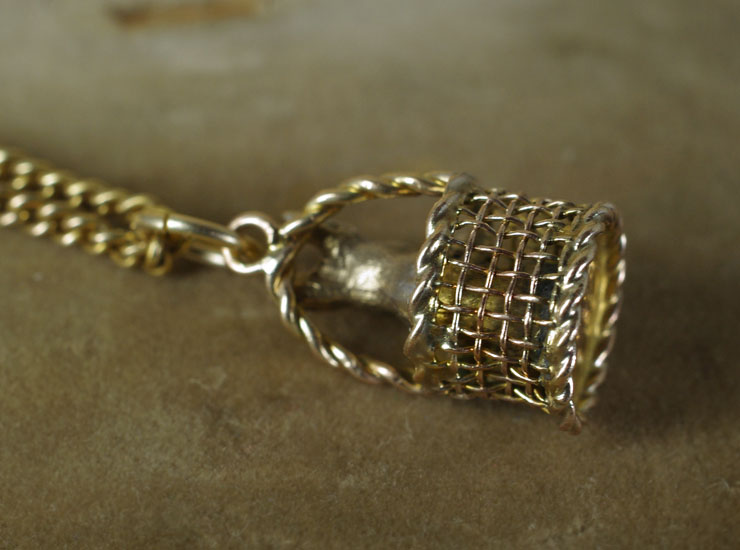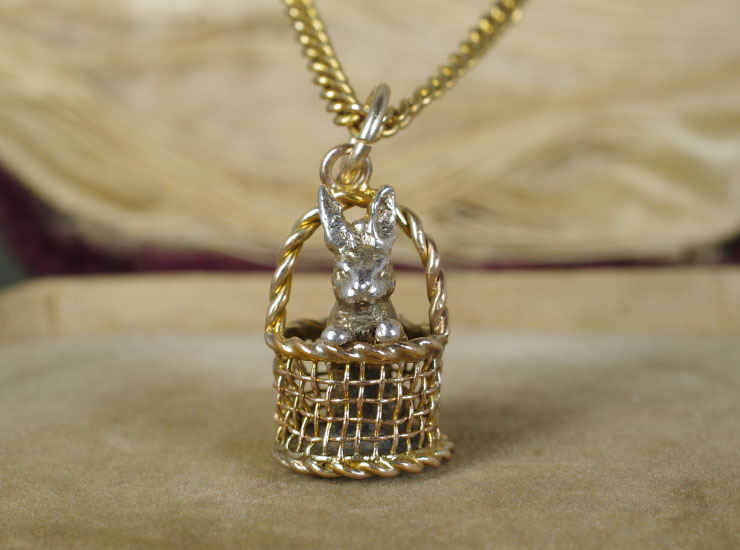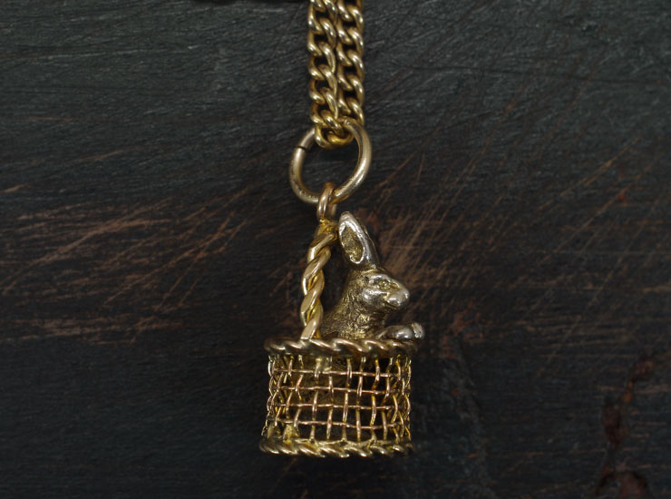 1960年-1970頃のイギリス製ヴィンテージチャームです。バスケットからぴょこんと顔を出した可愛らしいウサギのチャーム・ペンダント。細やかに編まれたバスケットに、リアルな作りのウサギから見て分かるように、小さいのに丁寧に作られた上質なチャームです。地金はバスケット9金で、ウサギはシルバー。ずしりと重量があるのもチャームの風合いにぴったりで、ウサギ好きの方にぜひお勧めしたい素敵なヴィンテージチャームです。
