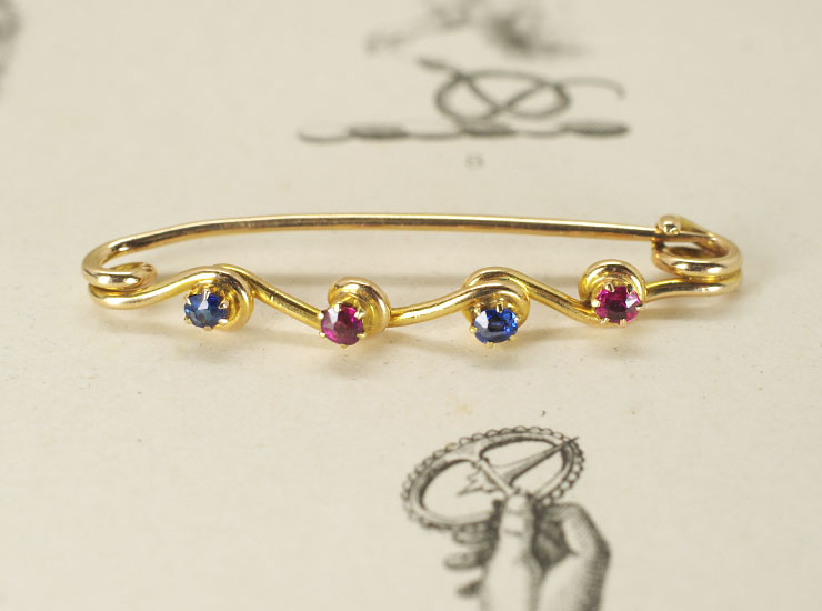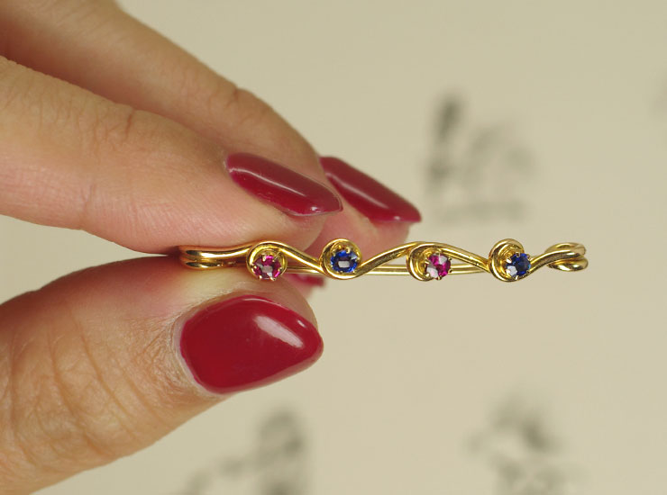1900年頃のイギリス製アンティークブローチです。小さなルビーとサファイアが交互に並んだ手作りの温かみの感じられる可愛らしいブローチです。ウェーブラインのブローチは、まるで一筆書きのように一本の金線を曲げたり伸ばしたり巧みに使いこなして作られています。繊細で華奢に見えますが、実際に手にすると思いのほか日常的に気軽に使えそうな丈夫な作りなのも魅力です。