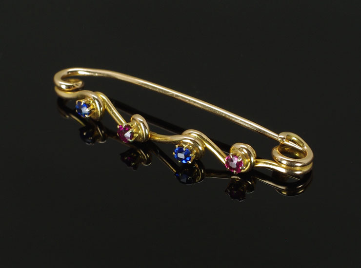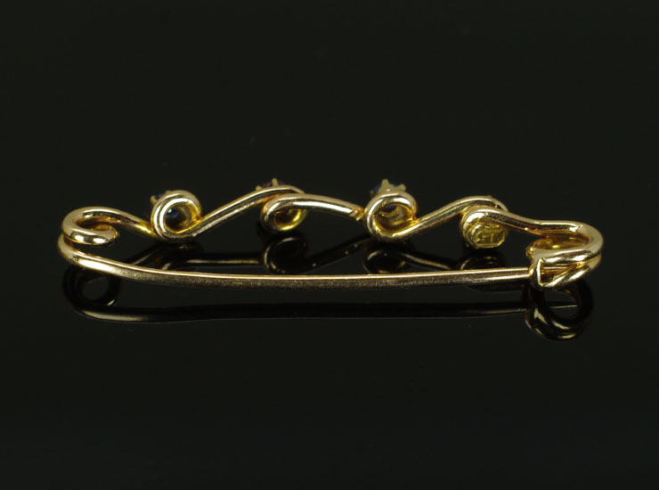 ブローチに「15」と15金を示す刻印入り。アンティーク15金ルビーサファイアブローチは良い状態です。