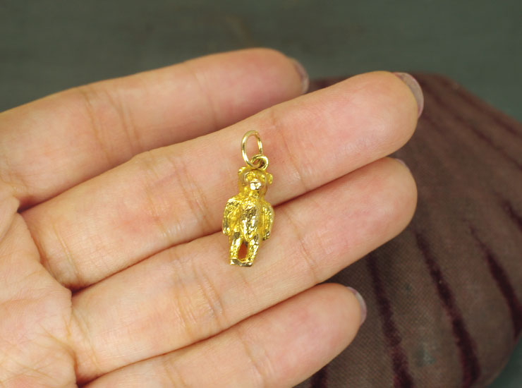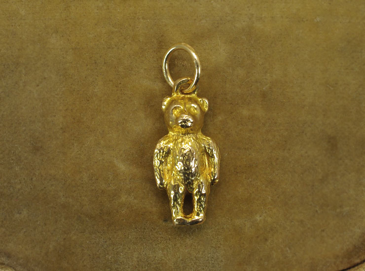 1970年のイギリス製ヴィンテージチャームです。地金は9金。キョトンとした顔の可愛らしいテディベアのチャームです。指先程のとても小さなチャームですが、立体的で本物のテディベアをそのままミニチュアにしたような形です。中は空洞ではないため、小さいながらしっかりとした重量があります。