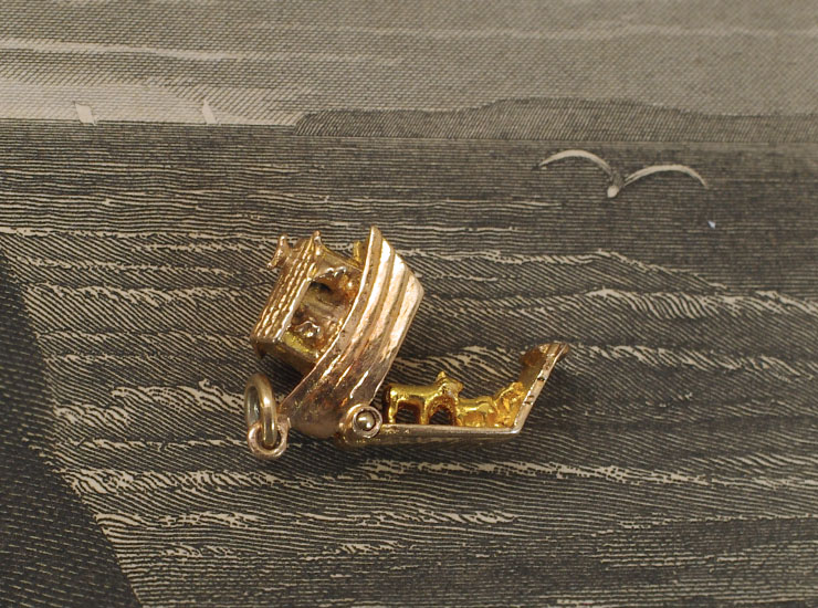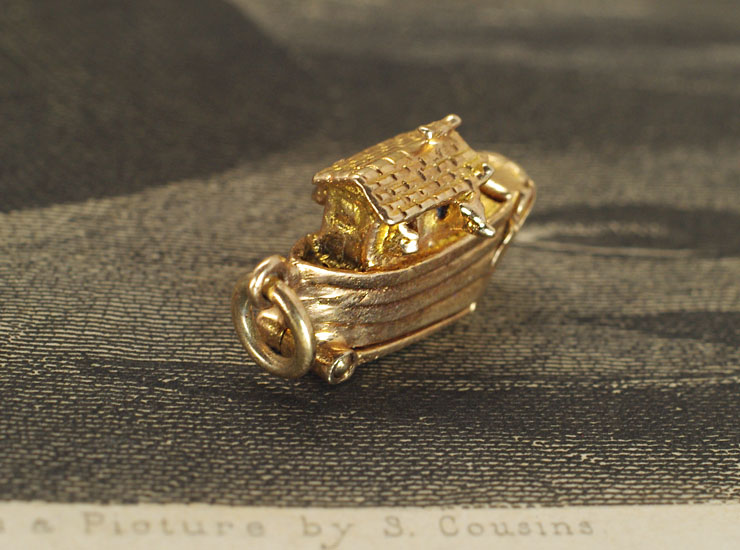 1964年のイギリス製ヴィンテージチャームです。旧約聖書に登場するノアの方舟のゴールドチャームです。舟が開く仕掛けになっていて、中には動物たちが乗っています。閉めた状態で縦9ミリ×横12ミリと小さなチャームですが細やかな作りで、動物が中だけではなく窓から顔を出していたりと凝っています。地金は9金。カチリと音を立ててしっかり閉まります。上質なヴィンテージチャームです。