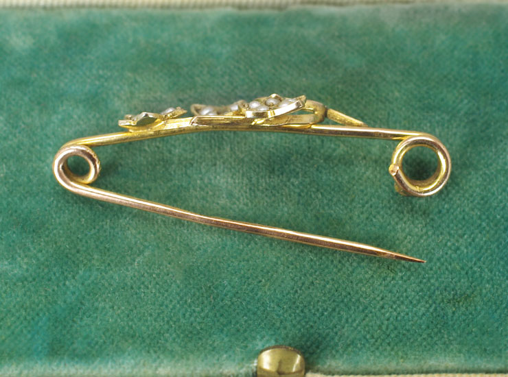 地金は9金。このようなタイプのアンティークブローチはイギリスのものでも刻印が入っていないか、金の品位だけが入っているものがほとんどですが、こちらのブローチのピン部分にはホールマークだけではなく、メーカーのマークまで入っています。ブローチ初心者の方にもお使いいただきやすいデザインだと思います。
