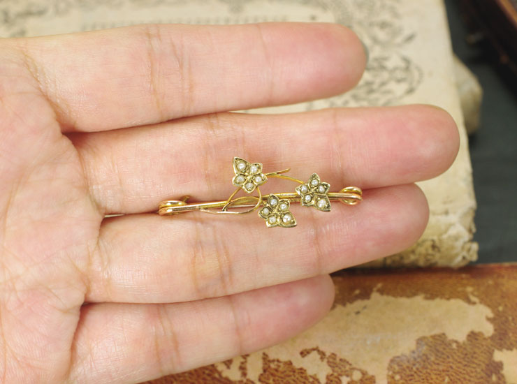 アンティーク9金シードパール蔦の葉ブローチ