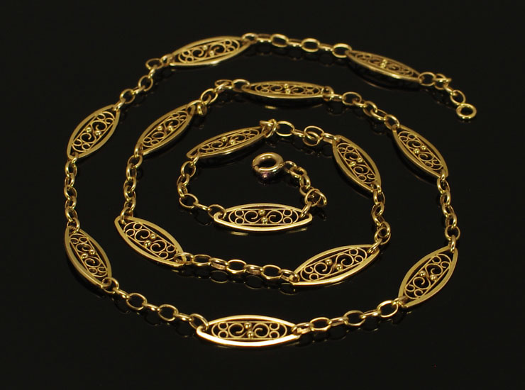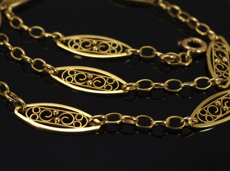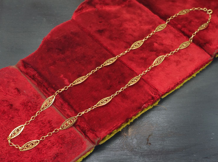 地金は18金。長さは60センチ(留め具を含むと61センチ)。ボート型のモチーフは7ミリ×20ミリ。人気が高いにもかかわらず、入手が困難なジュエリーの一つです。状態もとても良く、一生もののアンティークフィリグリーネックレスです。