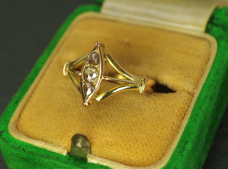 1900年頃のアメリカ製アンティークリングです。3石の小さなローズカットダイヤモンドが優しく輝く指輪。ダイヤモンドは原石を思わせるカットで煌びやかに輝くというよりは、不規則なファセット面に光を受けると乱反射の渋い輝きを見せてくれます。マーキスシェイプのアンティークリングは存在感のある大きなものが多いのですが、こちらは小ぶりでさりげなく身に着けられます。小ぶりではありますが、シャープなマーキスシェイプと渋い輝きを放つローズカットダイヤが相まって、フェミニンになりすぎず格好良い印象です。