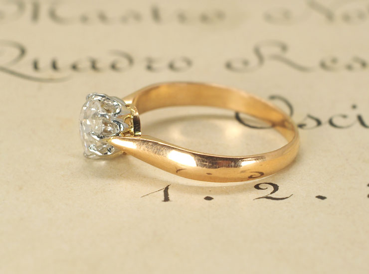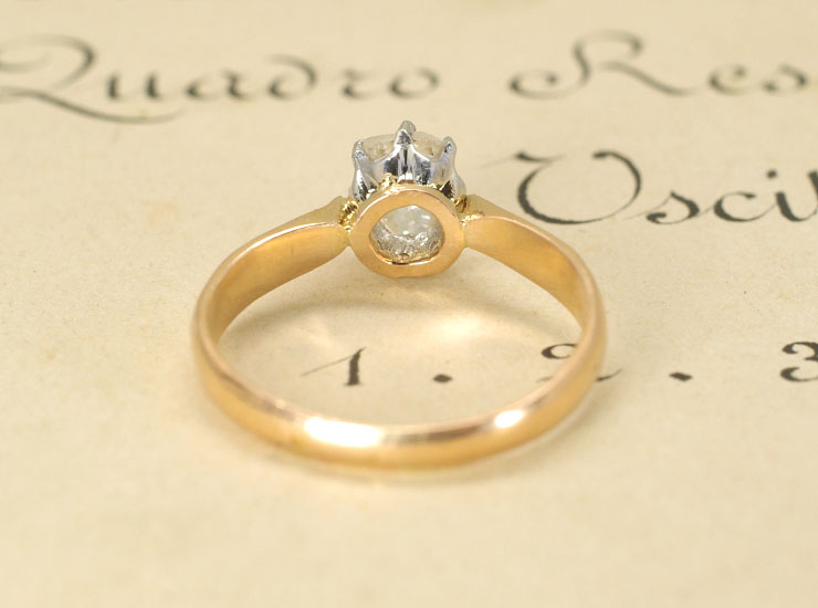 地金は爪のみ18金ホワイトゴールドで他はすべて18金ゴールド。明るいピンクを帯びた美しいゴールドです。リングの外側には1838年から1919年までの短い期間に、一部のゴールド製品にしか使用されなかったフランスの18金のホールマーク「馬の頭」が入っています(掲載写真)。掲載写真でご覧いただけるのですが、ホールマークの近くに傷があります。この傷は簡単に綺麗に直すことができますが、傷がホールマークの近くにあるため、傷を直すとホールマークも消えてしまいます。サイズ直しを含め、傷を消すのをご希望の場合は、無料で承りますのでご購入前にご相談ください。(傷は肉眼ではあまり気にならない程度ですのでそのままご使用いただけます。)