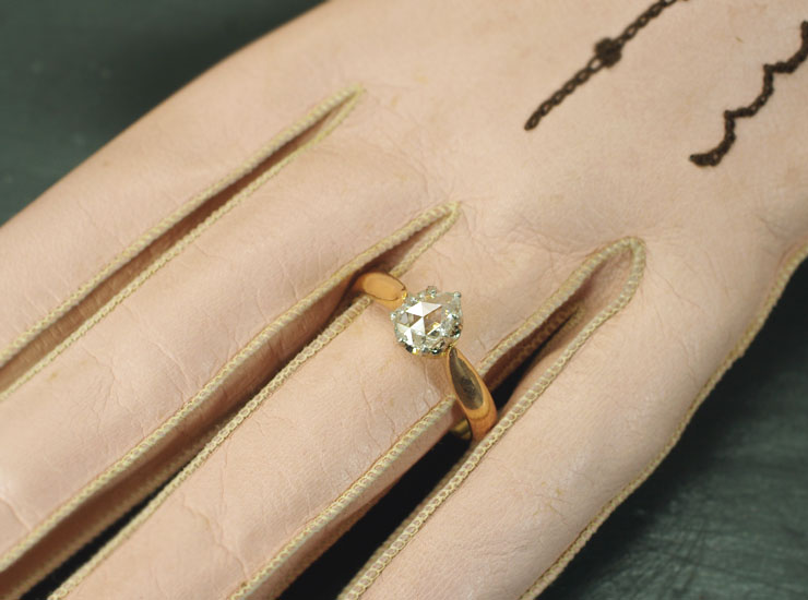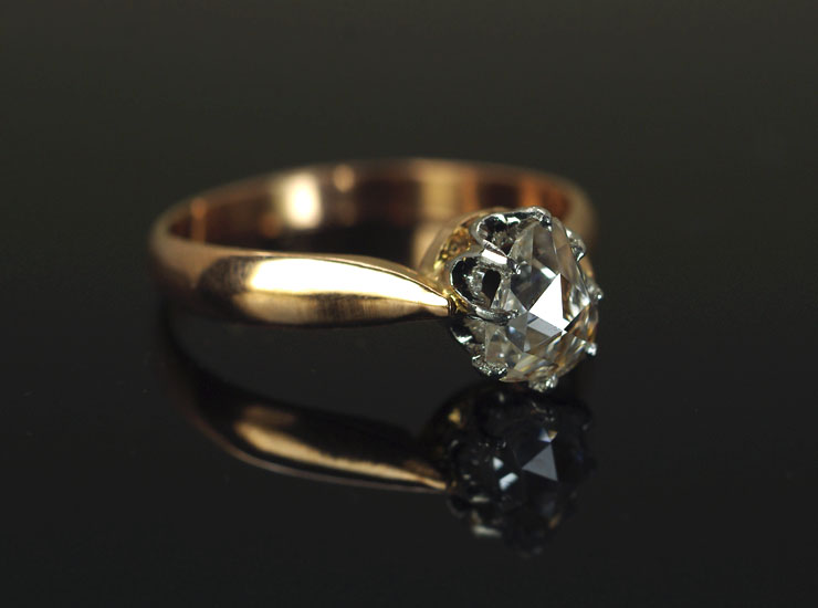 1900年頃のフランス製アンティークリング。美しいローズカットダイヤモンドの指輪です。透明感溢れるダイヤは、繊細に輝く一滴の雫のよう。キラキラと絶え間なく光を放ちます。ダイヤは縦6.5ミリ×横5ミリ(縦横一番長さのある箇所を計ったサイズ)。しっかりと存在感のあるサイズのダイヤです。