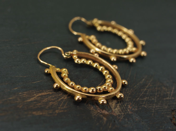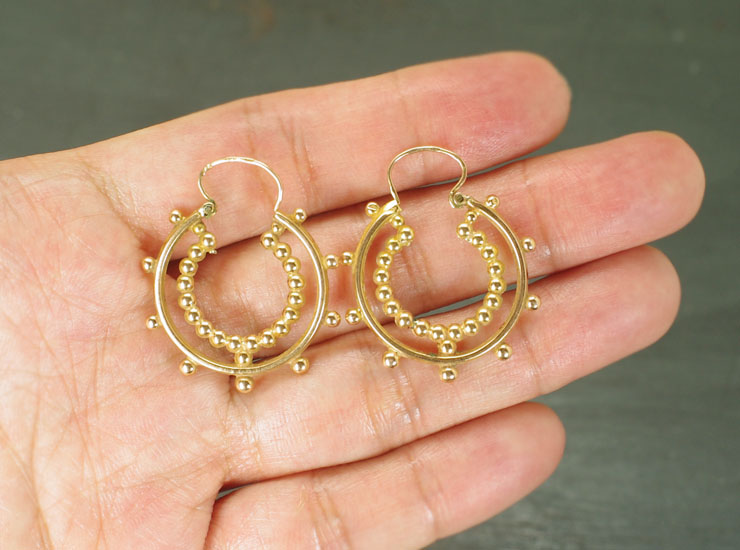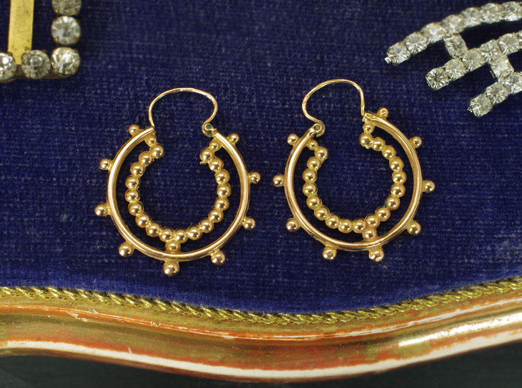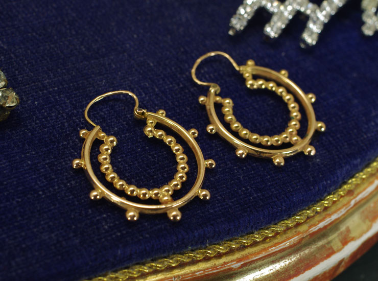 1890年頃のフランス製アンティークピアス。粒金のフープが華やかです。フランスではフープ(輪っか)タイプのピアスはCRÉOLES(クレオール)と呼ばれています。輪っかが二重になったようなデザインで、外側の輪は間隔をあけて粒金が配置され、内側は粒金を繋げた輪になっているという面白い作りです。