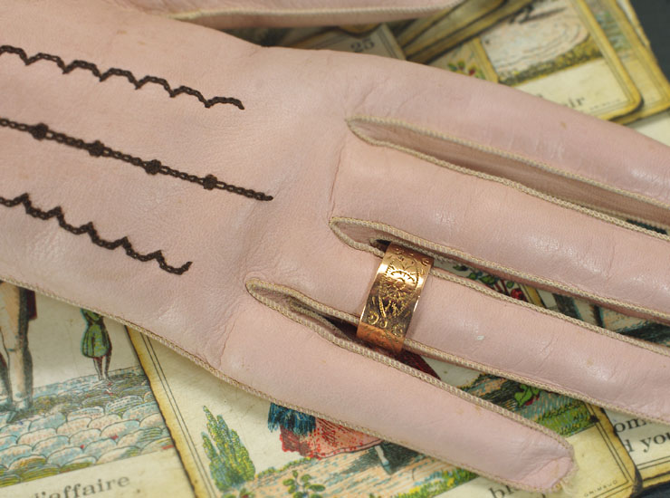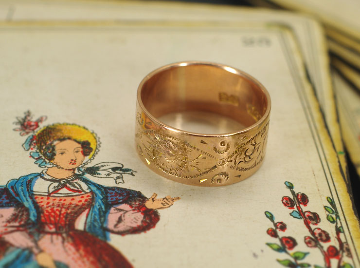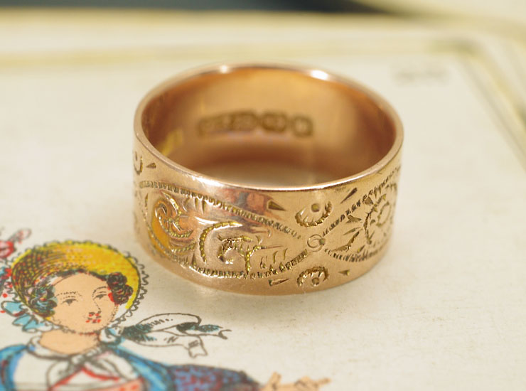 1896年のイギリス製アンティークリング。草花が手彫りされたどこか素朴で可愛らしいヴィクトリアン後期のリングです。地金は美しいピンクを帯びた9金で、リングのあたたかな雰囲気によく合っています。リングの幅は8ミリと幅広のデザインですので、実際のサイズよりも1号〜1.5号程度小さく感じられる方が多いと思います。掲載写真では、反射や影が映りこみ傷が目立ち黒ずんでいるように見えますが、実物は傷もまったく目立たず綺麗な状態です。約120歳とは思えないチャーミングなアンティークリングです。※リング全体に模様が彫られているため、サイズのお直しはできません。