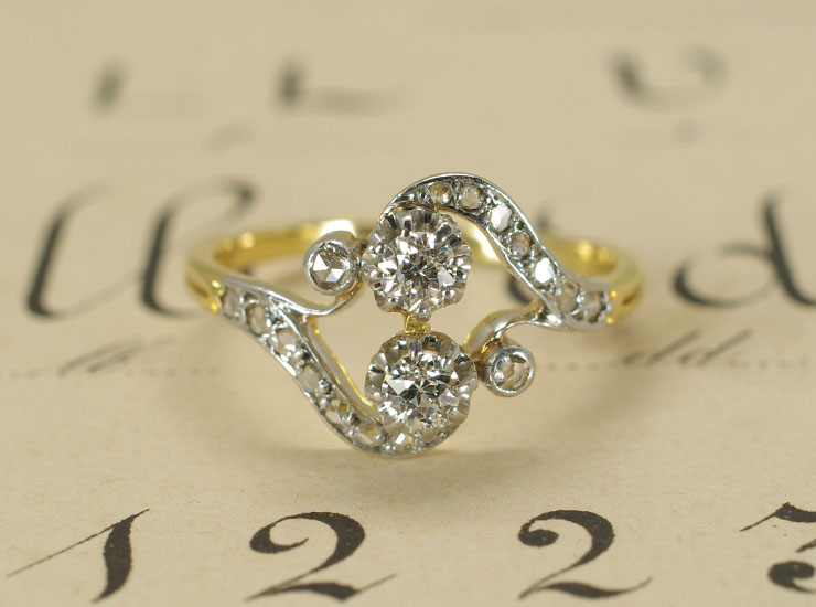 1910年頃のフランス製アンティークトワエモアダイヤモンドリングです。Toi et Moi(トワエモア)とはフランス語で「あなたと私」 という意味で、仲良く支え合う恋人同士または夫婦のようなデザイン。眩い輝きのメイン2石のダイヤはオールドカットで3ミリ。サイドには1.3ミリの小さなローズカットダイヤが寄り添い、小さいながらキラキラと輝きます。曲線のラインには7石、合計14石の原石のようなラフなカットのローズカットダイヤが並び、その不規則なカット面に光が当たるとほとばしる水のように輝きます。